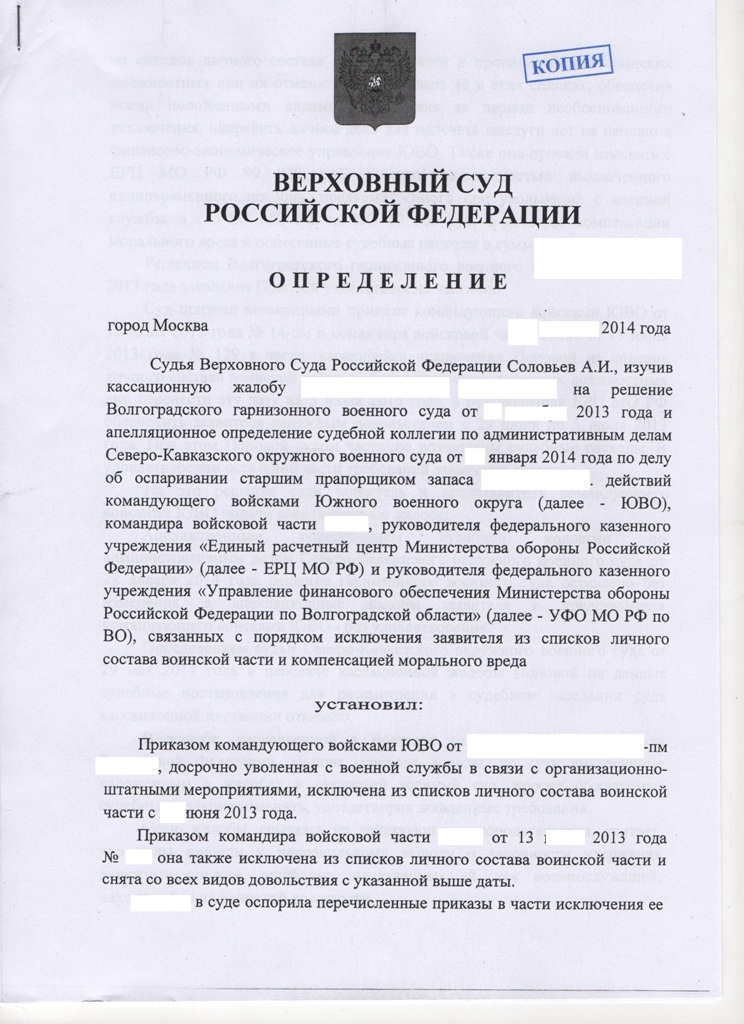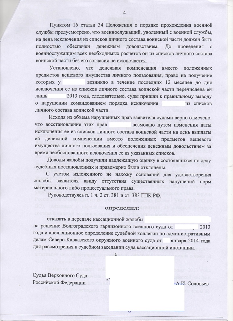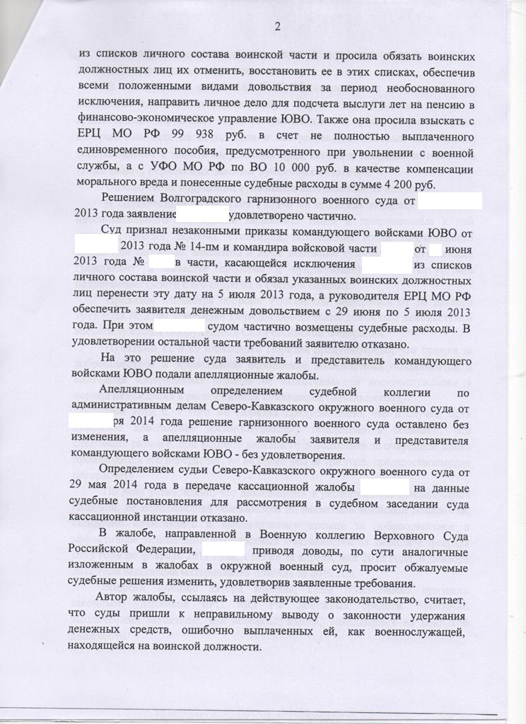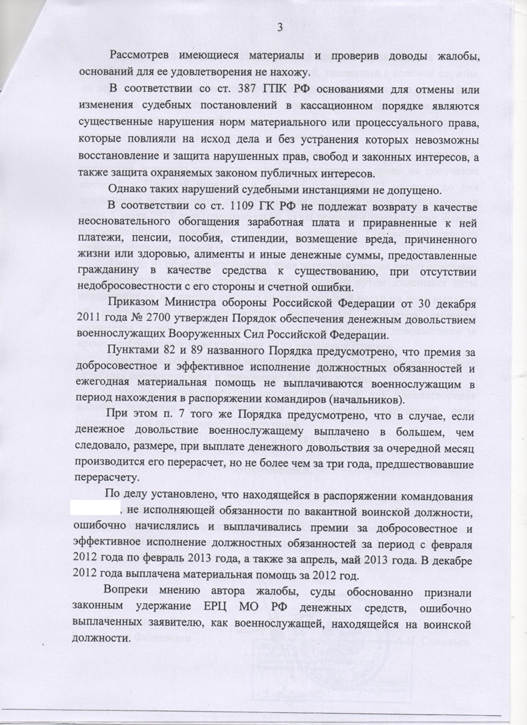 В кассационной жалобе расписал на каких основаниях считаю незаконными действия и ерц и судей и то что предмет спора в суде первой инстанции подменили. Вчера получил ответ, все из того же Северо-Кавказского окружного военного суда-в передаче для рассмотрения отказать.