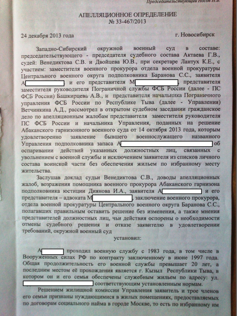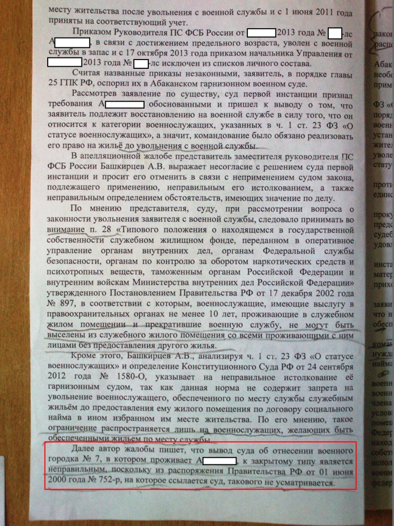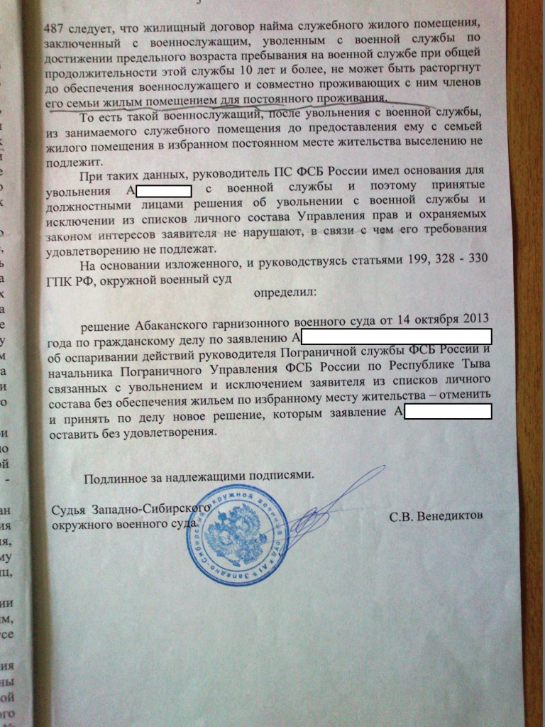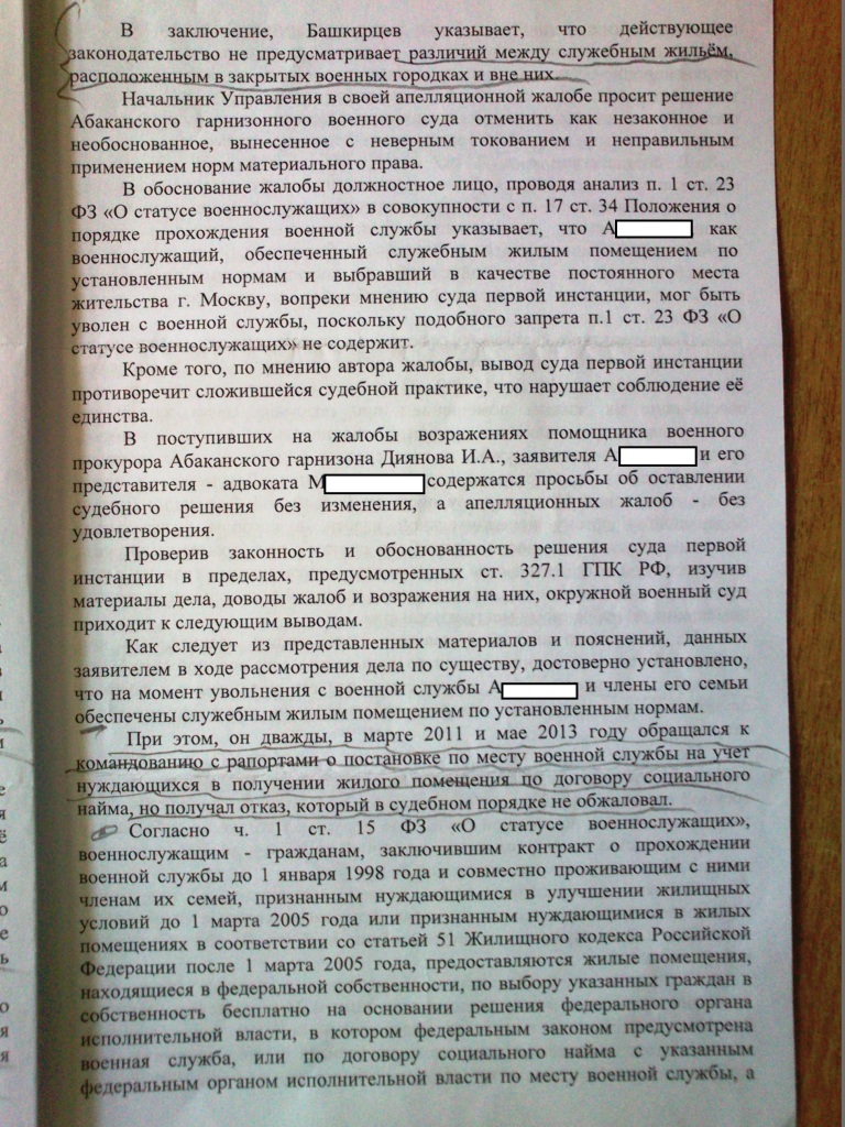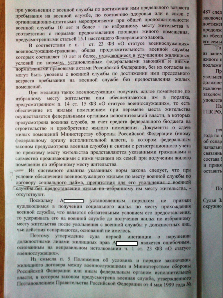спасибо, прочитал. Ещё один перл в копилку глупости судей в мантии, характерно то, что они грубо манипулируют понятием "жилищное обеспечение" и что может являться таким жилищным обеспечением, то есть, наличие гарантии о не выселении из служебного ЖП не может свидетельствовать о факте обеспечения жилым помещением по месту службы (увольнения). В этом решении есть такая мысль но, она высказана в ином смысле. Далее, это определение, обжаловалось?