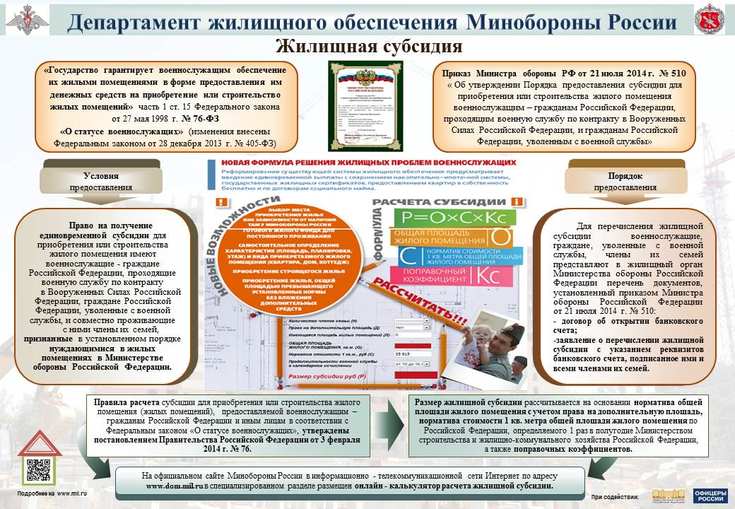 Информируем Вас о том, что Правительством Российской Федерации выделена большая сумма денег для обеспечения граждан, признанных нуждающимися в жилых помещениях, денежной субсидией для приобретения или строительства жилья (жилищной субсидией). Первоочередное право на получение жилищной субсидии имеют военнослужащие, признанные нуждающимися до 01 января 2012 г.