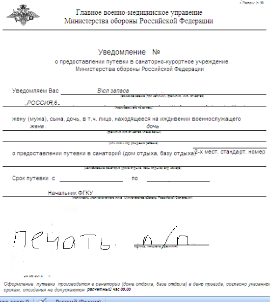 2. Справку из военкомата, подтверждающую право на получение льготной путевки в санаторно-курортное учреждение Минобороны России.