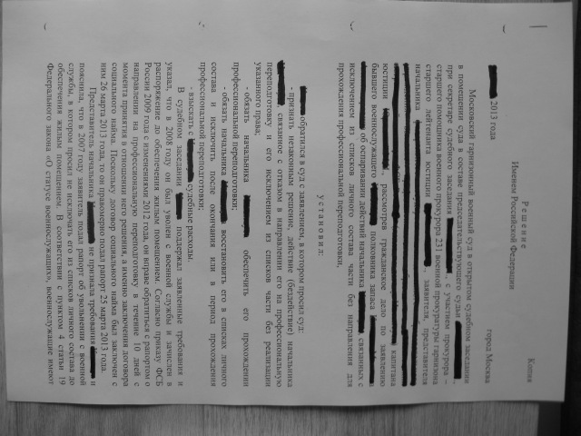 Заявление в суд, решение суда (МГВС), апелляцию в МОВС и выписку из Приказа ФСБ о переподготовке — прилагаю. Суда по апелляционной жалобе ещё не было. Поэтому, если будут замечания и предложения по тексту апелляции — буду признателен.