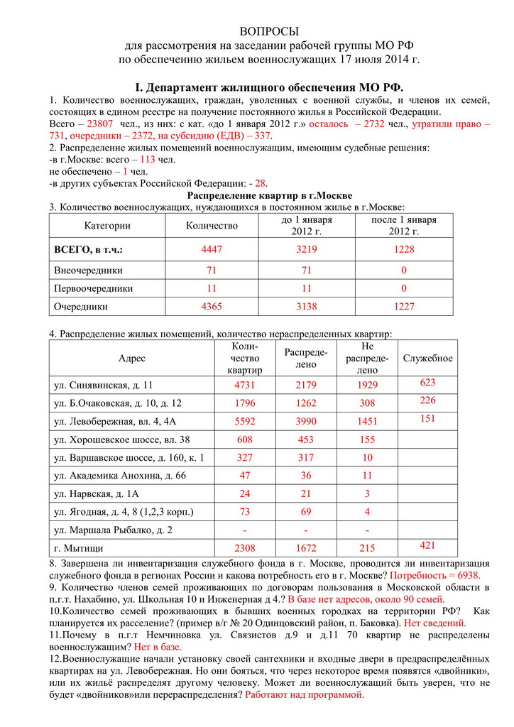 Вопросы к Рабочей группе при МО РФ по жилищному обеспечению