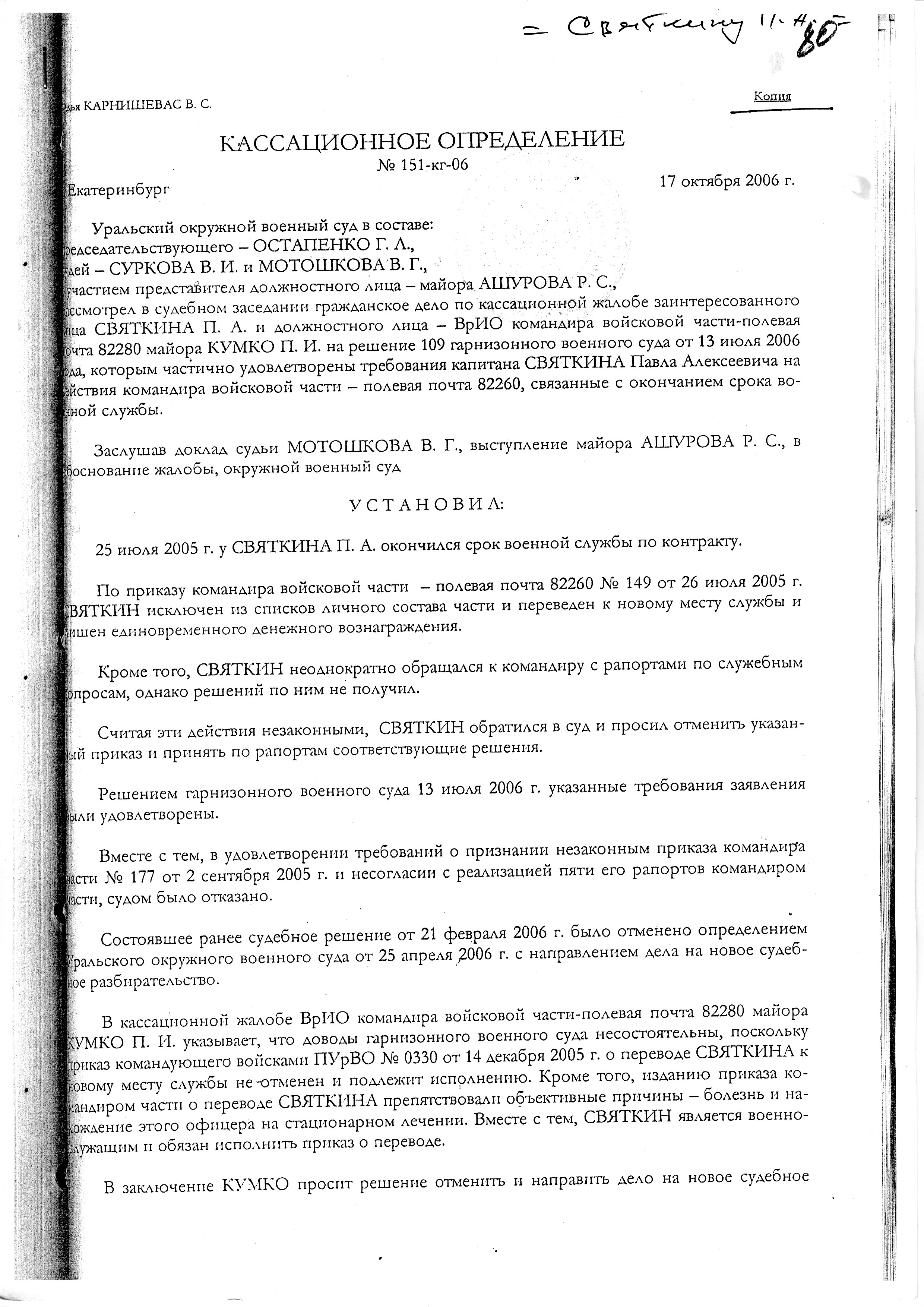 #165На решение выложенное мной выше (по увольнению без обеспечения) подали касжалобу. Пойдем до ВС. Интересно мнение, может чего и выскажут, кто то жв этой фигне должен точку поставить. А то видите ли военный много получит в связи с восстановлением. Прикладываю свою касжалобу. Судя по всему она многим еще понадобится.....