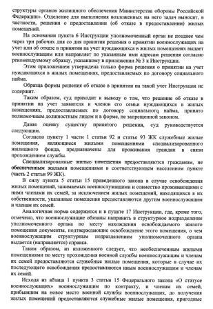 Во-первых, реализация мной прав вытекающих из ст.40 Конституции РФ и ст.15 закона РФ «О статусе военнослужащего» ни как не может быть поставлена в зависимость от действий или бездействий иных граждан, не являющихся членами моей семьи. Ни указанные статьи закона, ни подзаконные акты (Правил утверждённые Постановлением Правительства РФ №512 от 29.06.2011г., Порядок Утверждённый Приказом МО РФ №1850 от 13.10.2011г.) ни какие-либо иные нормы права не предусматривают возможность отказа в выдаче справки о сдаче жилья военнослужащему на том основании, что в служебном жилье подлежащим сдаче, зарегистрированы, либо имеют жилищные права другие граждане. Следовательно, отказ в выдаче справки не основан на законе.