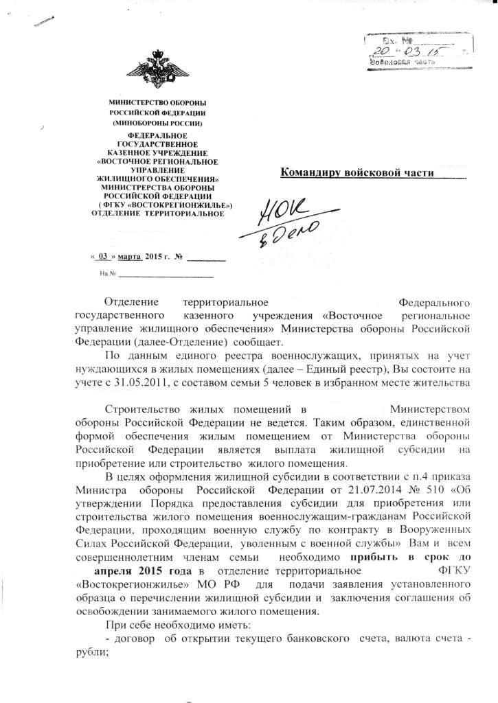 Вам и всем совершеннолетним членам семьи необходимо прибыть до _______________ в Управление для подачи заявления установленного образца, о перечислении жилищной субсидии оформленного в соответствии с п. 4 приказа Министра обороны Российской Федерации от 21.07.2014 № 510 «Об утверждении Порядка предоставления субсидии для приобретения или строительства жилого помещения военнослужащим-гражданам Российской Федерации, проходящим военную службу по контракту в Вооруженных Силах Российской Федерации, уволенным с военной службы».