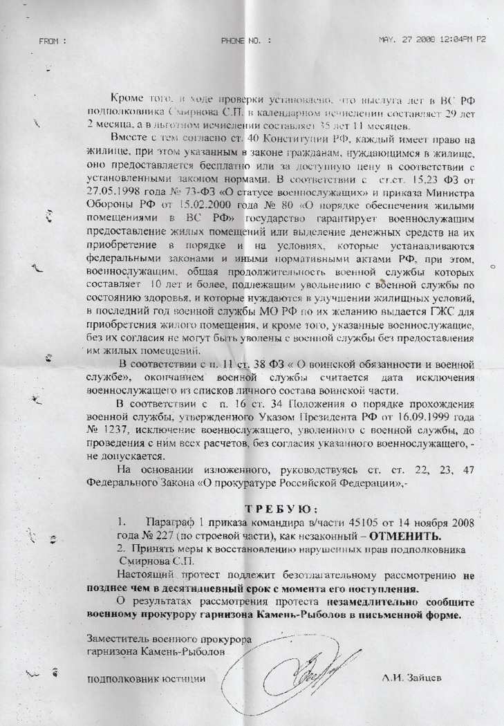 Ничего никто не забыл. Рано радовался на решение гарнизонного суда (восстановить меня в списках части до получения жилья по ИМЖ). Командир кассацию подал - наверняка всем Главком готовили. А в кассации ссылки на ВКПИ07-30, на КАСС 07-509, на Положение о порядке прохождения...ничего нового, те же яй.., только вид сбоку. Тем не менее военная прокуратура резко изменила своё отношение - не в мою пользу! За две недели поменяла своё мнение!Готовят ходатайство об отказе мне на кассационном суде, вчера узнал...Что случилось - ума не приложу.Возражения на кассацию отослал сегодня, будем ждать суда. Тревожно как-то. Неужели придётся идти дальше - в Верховный, Конституционный, в Страсбург, чёрт возьми? Терять и ждать мне больше нечего. Дослужился Родине, блин, 30 лет - коту под хвост...