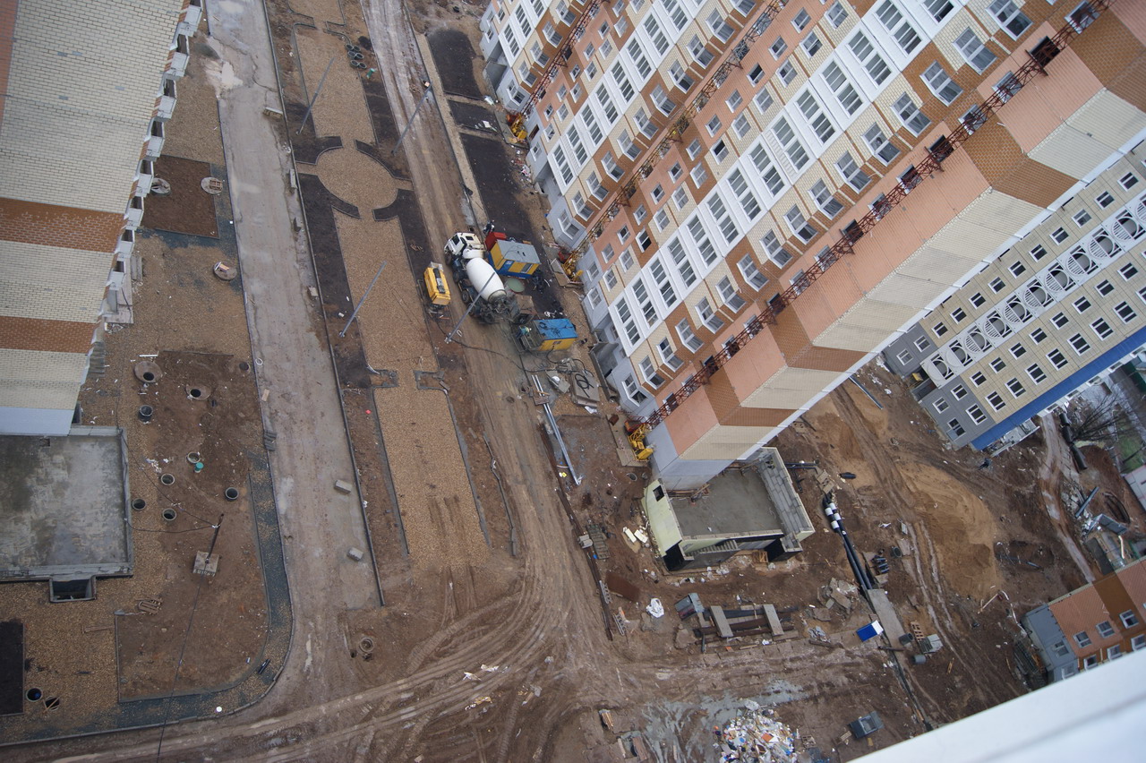 Вчера посетили стройку. Ключница дала ключ от корпуса (у нас 18 корпус башня) со словами "Идите смотрите", время не лимитировала. На 18 этаж пешком забирались, корпус обесточен, воды и отопления нет. На вопрос о сроках сдачи мкр пожимание плечами. Видели несколько бредущих работяг, между корпусами елозит экскаватор, зашла одна бетономешалка, грязи хватает (как раз шел дождь).