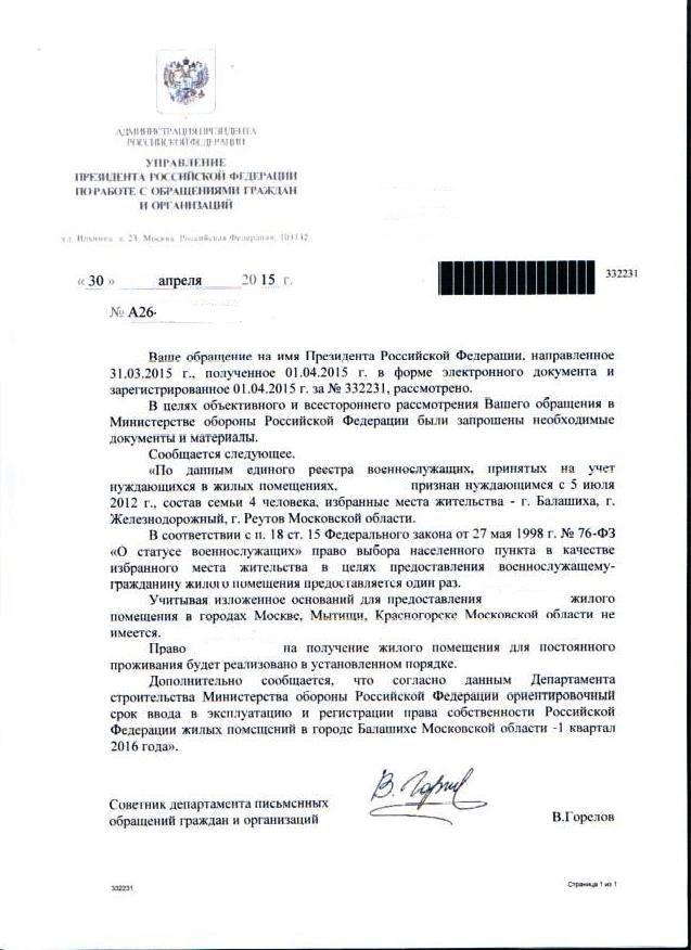 мои поздравления, уважаемый Конституция! процесс, кажется, пошел. теперь остается ждать ответа по существу и, разумеется, дальнейшие действия, в зависимости от их ответа. вполне возможно, что Вас в кратчайшие сроки попытаются "убрать" из армии, чтоб Вы больше не "возникали", тем более, подключая судебные инстанции. варианта здесь может быть два: либо по беспределу, либо предоставив Вам лакомый кусочек. договориться, так сказать, полюбовно. если они не дураки, то способны оценить Ваш набирающийся архив против них, а также - Ваше упорство. а посему, придется им малость шевелиться. больше всего, на мой взгляд, ценен вопрос о том, а почему не был направлен запрос о количестве необходимого жилья в Реутове? интересно, что они ответят именно на этот вопрос? ведь признать то, что запрос не делался - признать то, что они открыто не выполняют свои задачи, а это весьма пригодится в суде, особенно - в вопросе Вашего "злоупотребления" правом. скажут - делался, тогда придется скинуть Вам копию такого запроса и переключиться уже на департамент строительства. в любом случае, дело Вы сделали большое и не конечное, как Вы понимаете. все еще впереди. удачи Вам и не пропадайте)Дорогие друзья и сочувствующие, хочу похвастаться маленькой победой.