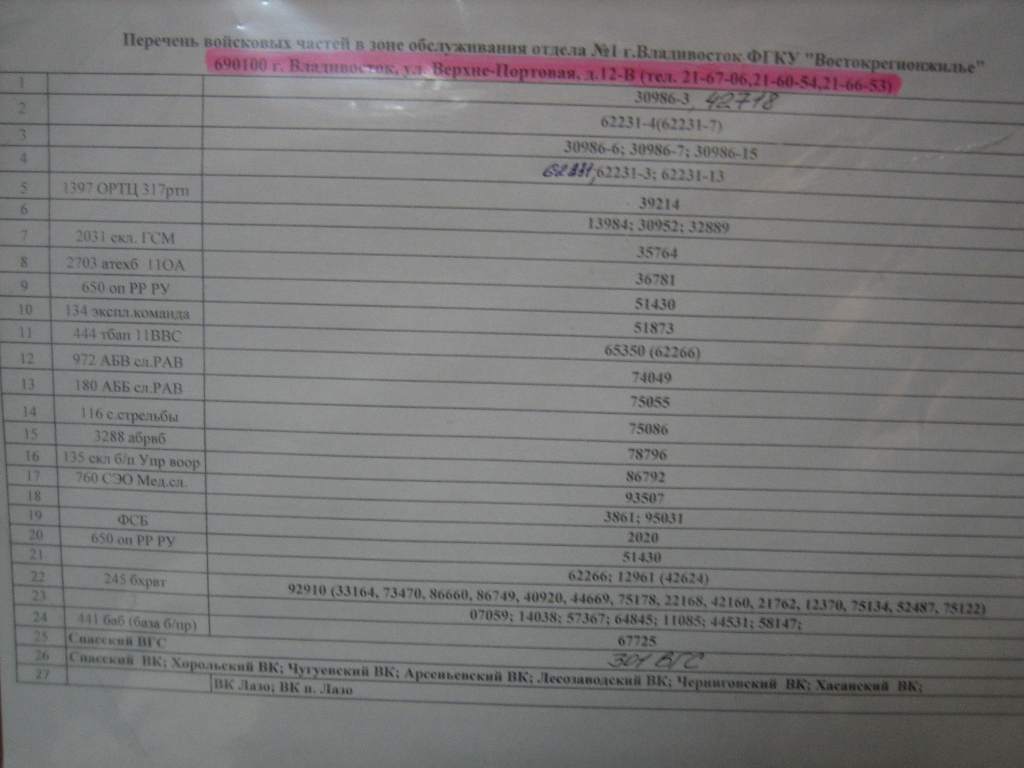 Перечень войсковых частей в зоне обслуживания отдела № 1 г. Владивосток ФГКУ "Востокрегионжильё":