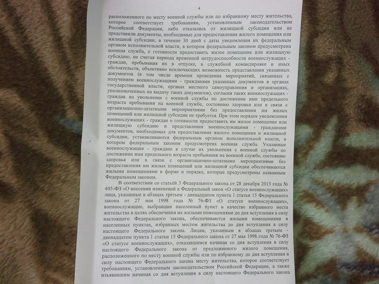 3. Обстоятельство вручения Уведомления создает угрозу нарушения моего права на обеспечение жилым помещением в качестве военнослужащего. Так как, при получении отказа на уведомление, кадровые органы в соответствии с вновь введенным абз.3 ст.23 ФЗ-76 от 27.05.1998г. обязаны включить меня в приказ на увольнение без моего согласия.