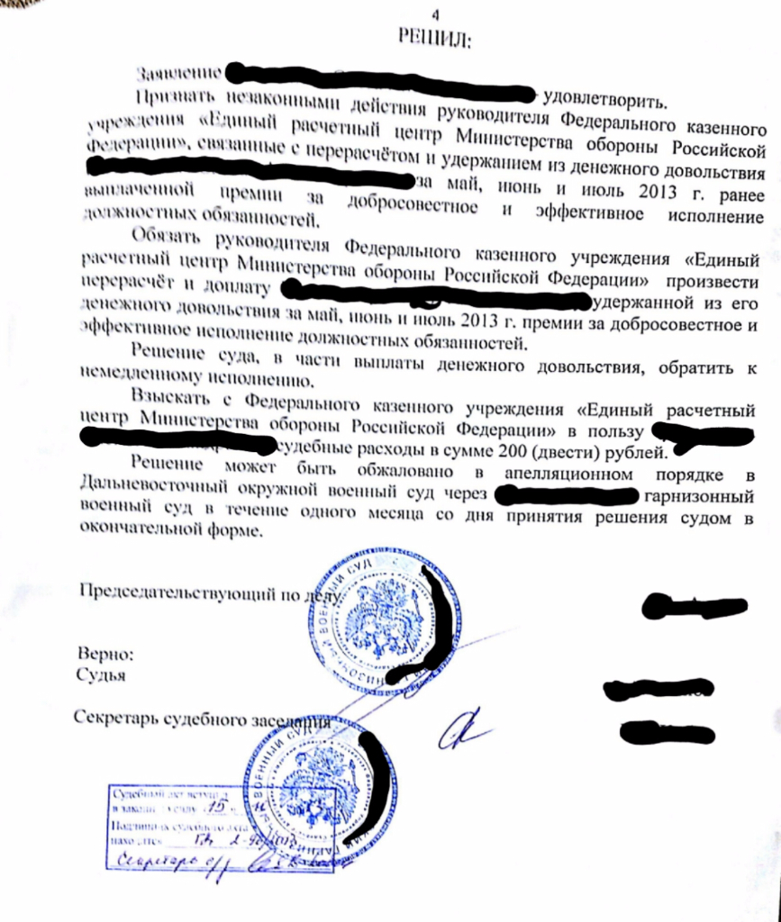 Решение суда было на другую тему - незаконность каких либо вычетов из ДД без решения суда. А это не одно и тоже с излишне выплаченной премией.QR_BBPOST Т.е. ставят под сомнение решение военного суда.