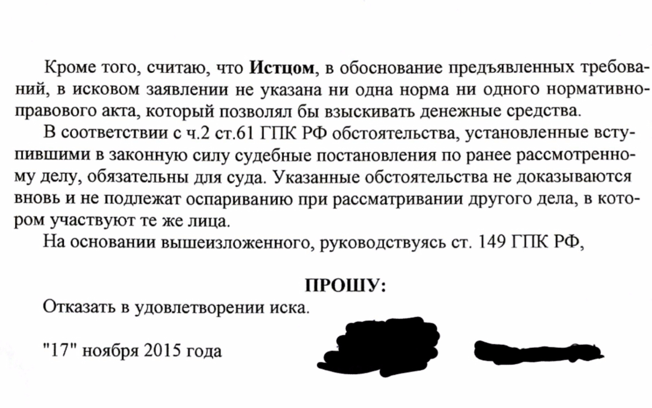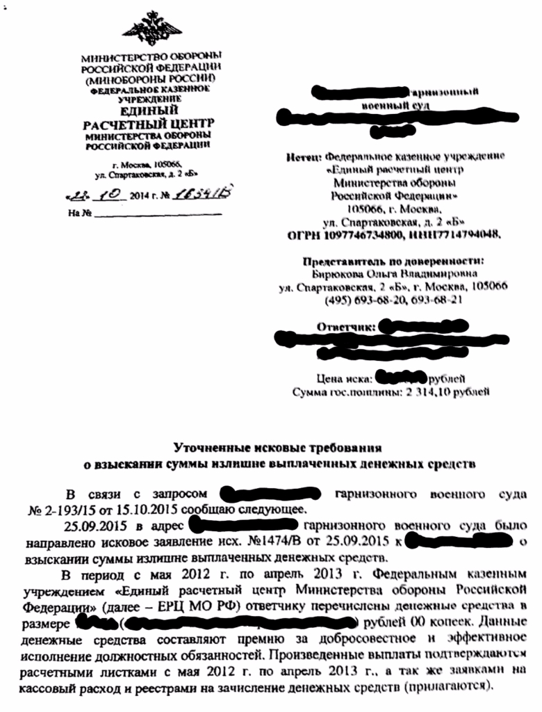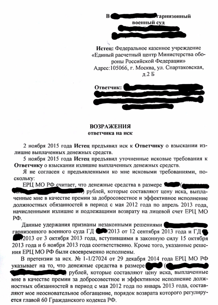 #2631Забрал иск в суде на ознакомление, написал заявление о переносе. В иске ерц ссылается, что военный суд не мог судить т.к. это гражданско-правовые отношения, обратились в мировой суд, судья узнав, что я действующий военный сказала, что наверное передаст дело в балашихинский гарнизонный суд. Иск от 10 ноября 2015 года, хотя с меня деньги удержали в мае 2012, значит уже в мае знали или предполагали о нарушении, и решение вступило в силу 1 октября 2012 года, они даже апелляцию не подали. Вообщем буду готовиться, буду рад советам, как их можно нахлобучить?