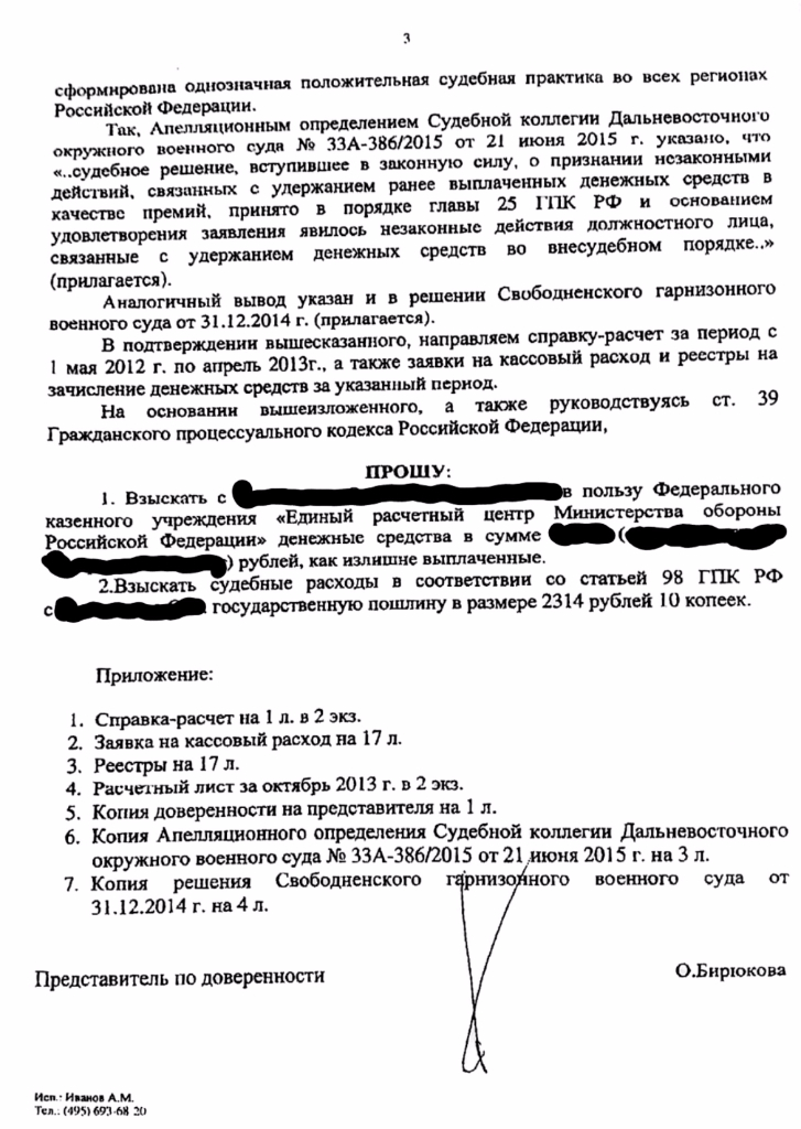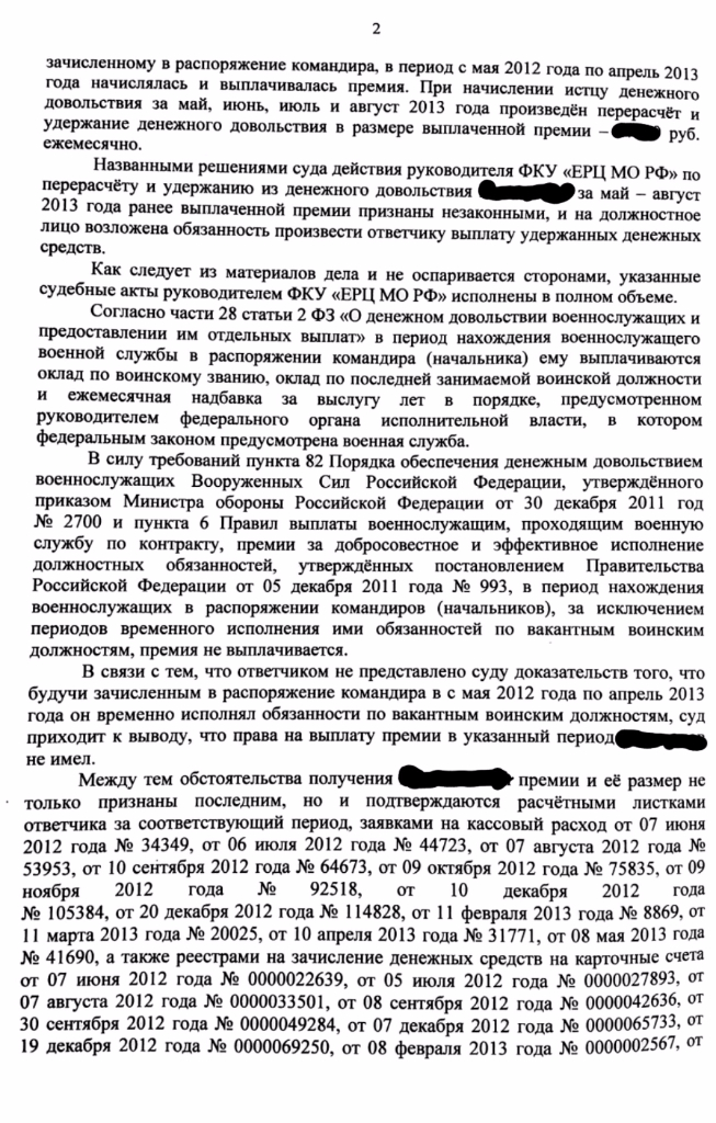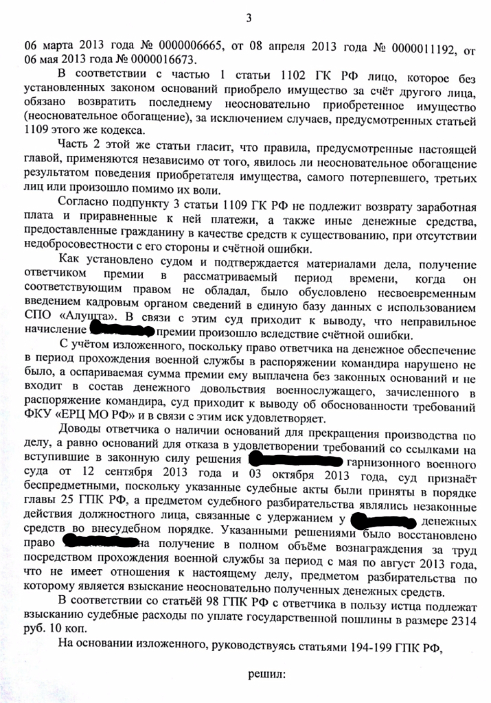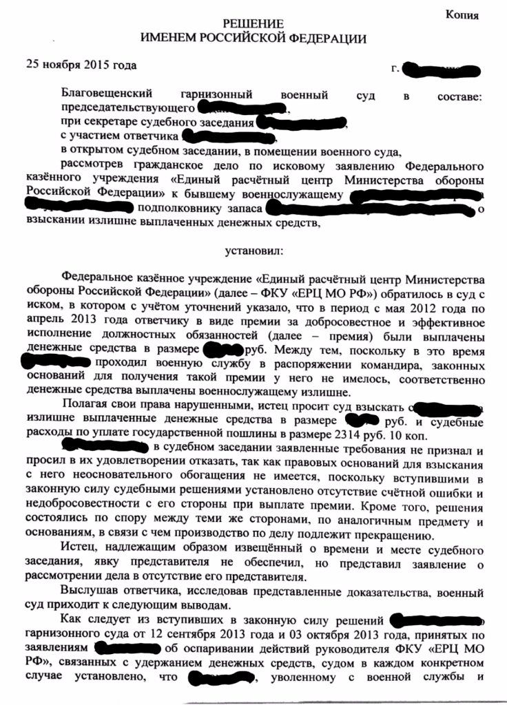 #2634Я отсудил у ерц в 2012 году премию, находясь в распоряжении, которую мне сначала начислили, а потом удержали из ден довольствия без суда. Теперь , спустя 3 с лишним года ерц подало на меня в суд и пытается вернуть выплаченные мне деньги, ссылаясь на то что они мне были не положены и по п.7 приказа 2700 был просто произведен перерасчет. Т.е. ставят под сомнение решение военного суда.Вы хоть поняли, что написали? Т.е. у Вас удержали премию и Вы пытаетесь вернуть.QR_BBPOST возврат премии удержанной незаконно из ден, довольствия в мае 2012 года.А здесь пишите, что в суд обратились не Вы, а ЕРЦ.QR_BBPOST Не спроста ерц обратилось на военного в гражданский суд.Это понятно и судья права.QR_BBPOST судья узнав, что я действующий военный сказала, что наверное передаст дело в балашихинский гарнизонный суд.