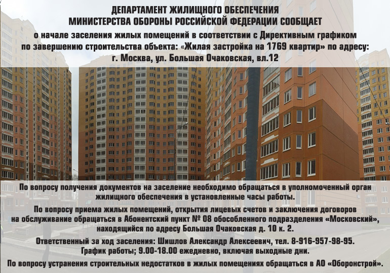 "Департамент жилищного обеспечения ожидает от строителей 16031 квадратный метр в жилых домах, расположенных на улицах Большая Очаковская, Синявинская, Левобережная и Хорошевском шоссе", – заявил руководитель департамента жилищного обеспечения Минобороны РФ Сергей Пирогов. По его словам, директивные графики по завершению строительства и вводу в эксплуатацию московских новостроек для военнослужащих опубликованы в разделе "Жилье военнослужащим" официального сайта Минобороны РФ. http://riarealty.ru/news_house/20151016/406308063.html
