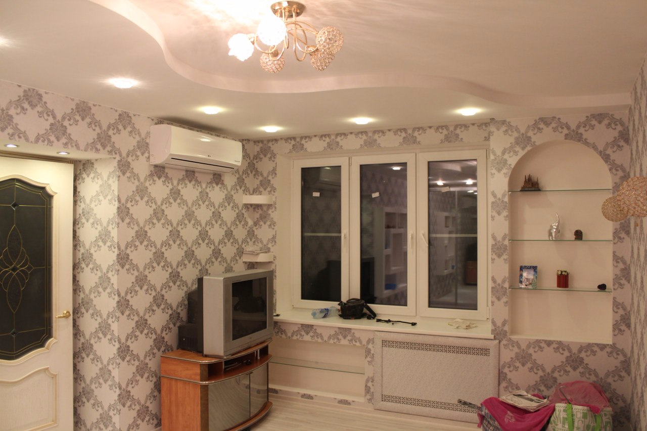 На сегодняшний день проделан полный демонтаж,сделана черновая разводка электричества,замена радиаторов и труб отопления.Выровнены стены (штукатурка под маяки), смонтирован потолок из гвл, отшпатлеваны стены,смонтирован теплый пол,выложена плитка в ванной и туалете.