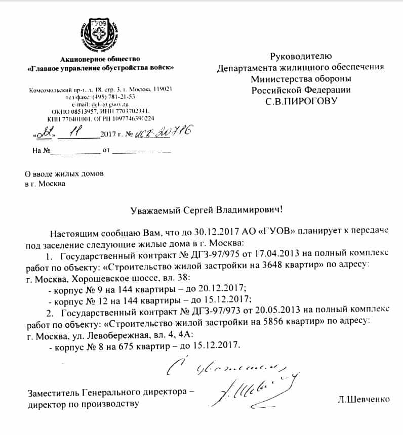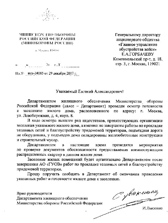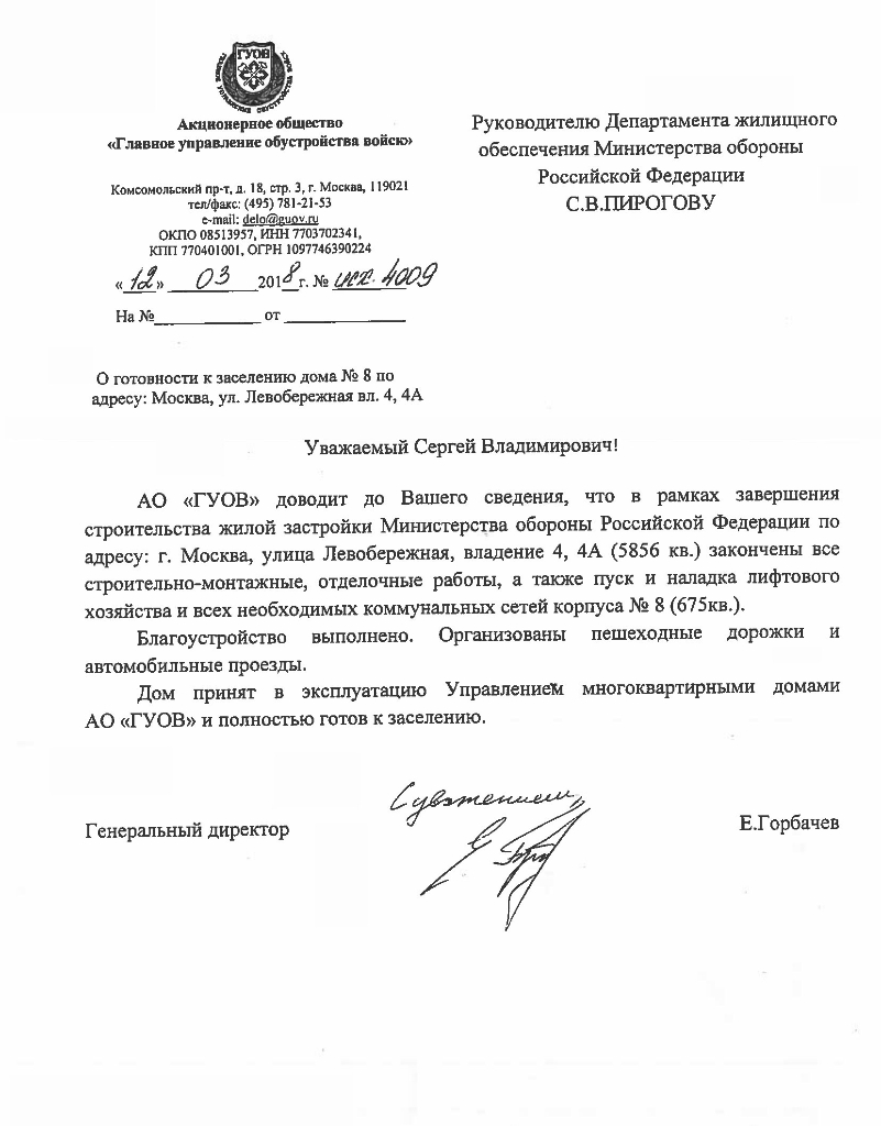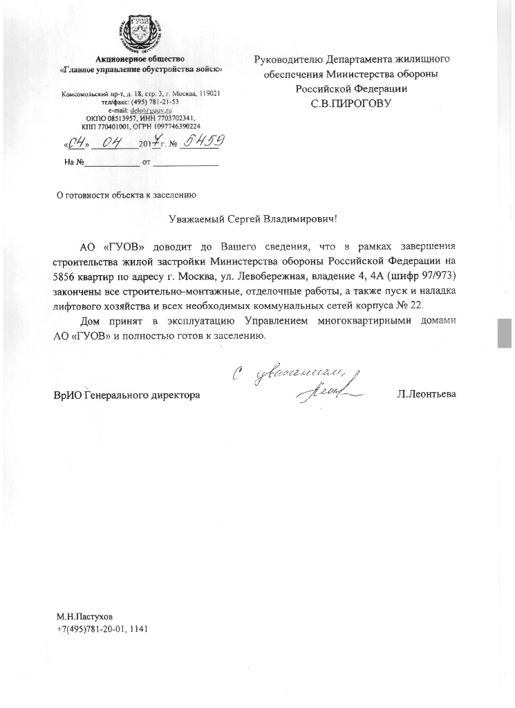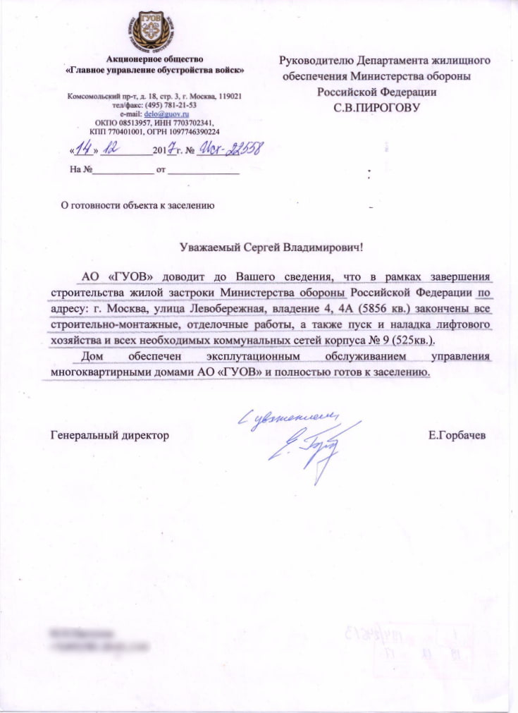 Департаментом жилищного обеспечения Министерства обороны Российской Федерации на основании сведений, представленных акционерным обществом "Главное управление обустройства войск" (далее - АО "ГУОВ"), о принятии в эксплуатацию жилого дома (письмо от 18 июля 2017 г.) и завершении регистрационных мероприятий по жилым помещениям (письмо от 5 декабря 2017 г.) с 19 декабря 2017 г. организовано заселение жилого дома по адресу: г. Москва, ул. Левобережная, д. 4, корп. 9.