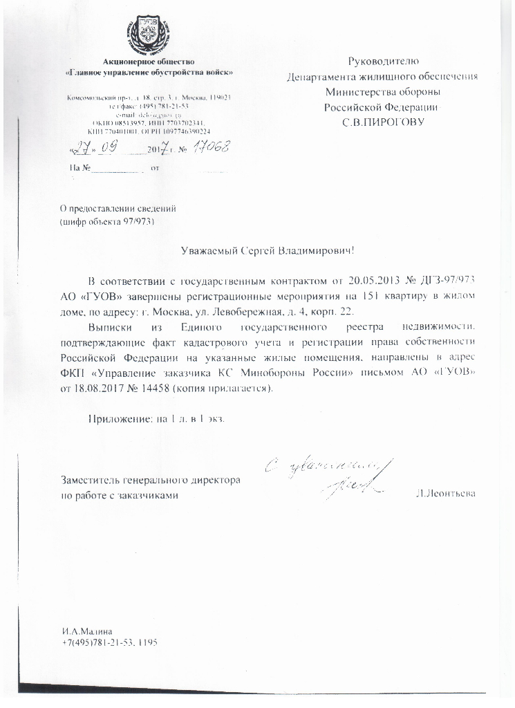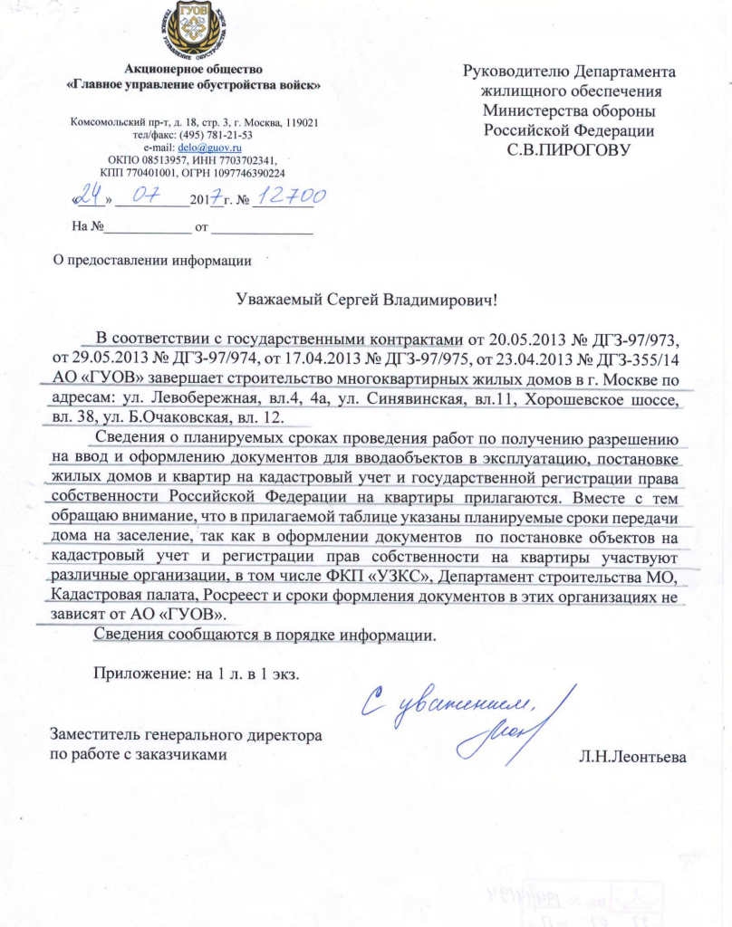 Информация подготовлена на основании письма заместителя генерального директора по работе с заказчиками АО «ГУОВ» Леонтьевой Л.Н. от 24 июля 2017 г. № 12700.