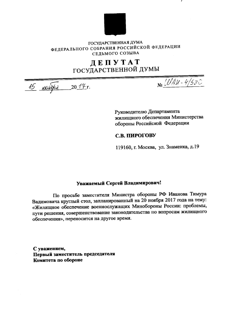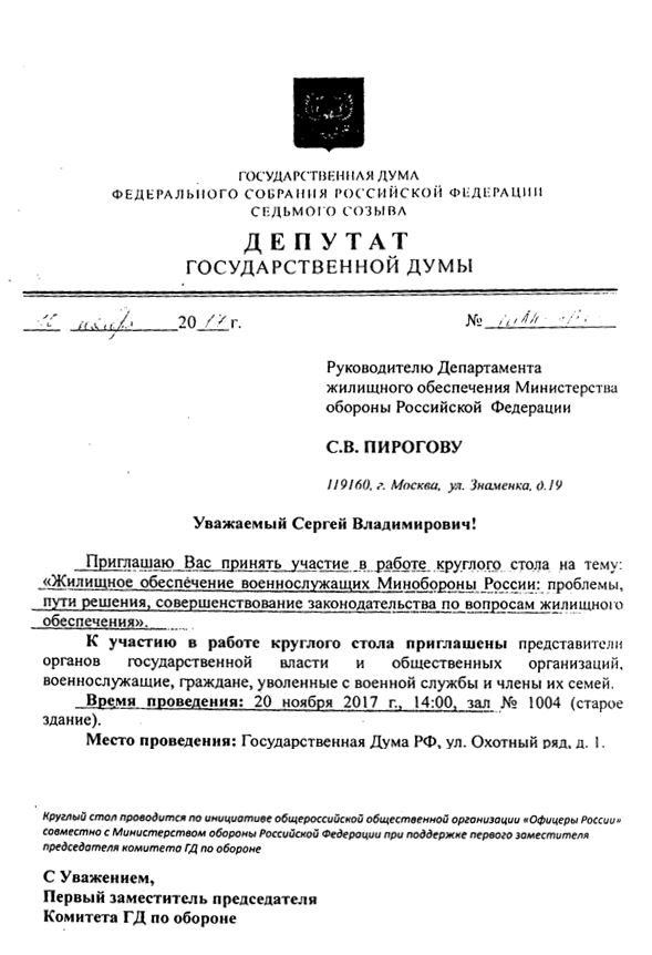 Круглый стол на тему: "Жилищное обеспечение военнослужащих Минобороны России проблемы, пути решения, совершенствование законодательства по вопросам жилищного обеспечения" переносится на более поздний срок в ноябре 2017 г.