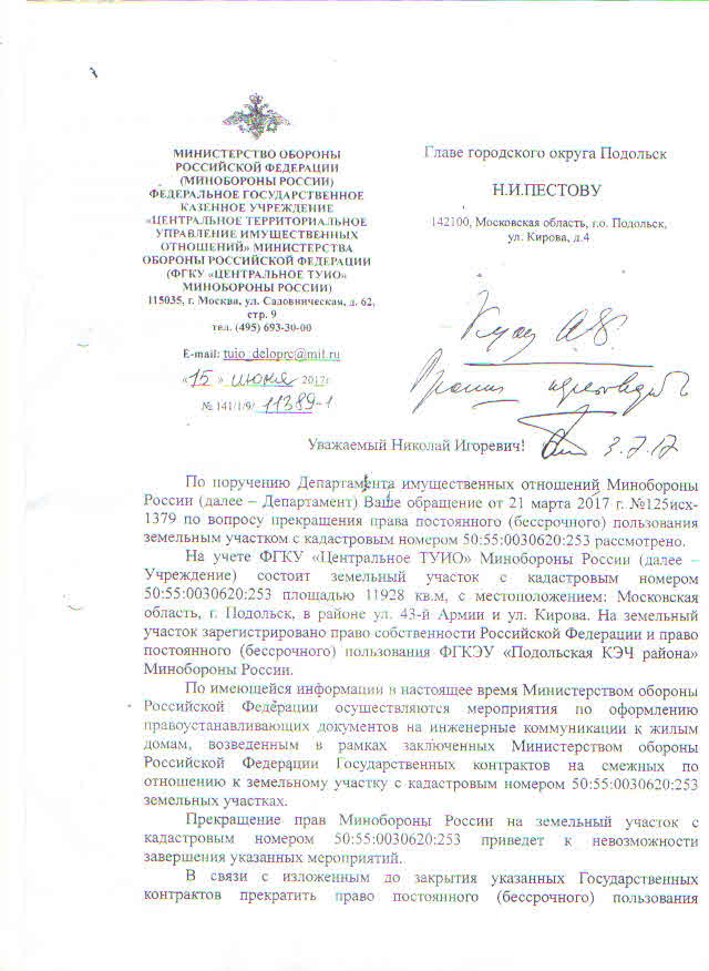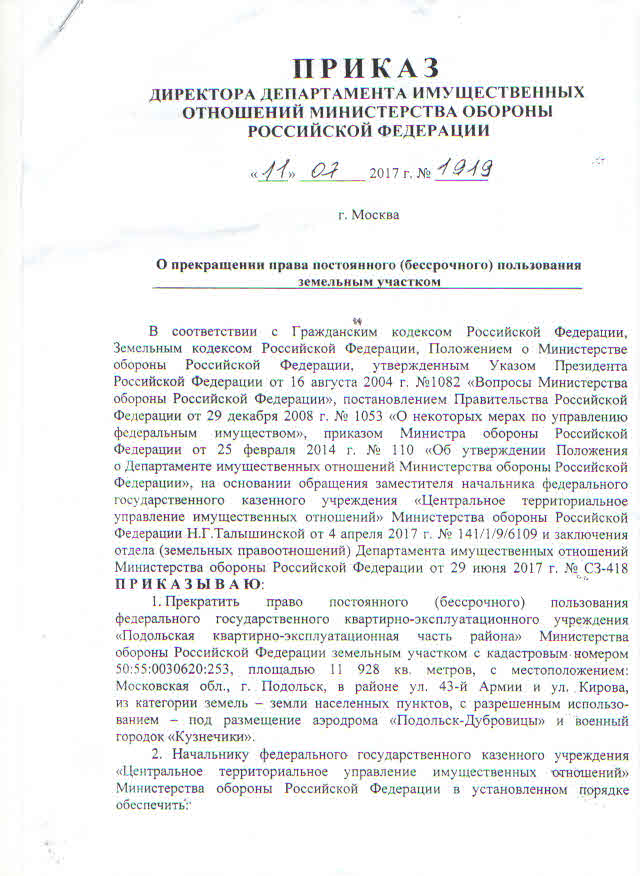После неоднократных обращенийжителей домаи Главы г.о.Подольск Пестова Н.И. по вопросу передачи земельного участка 50:55:0030620:253 собственникам многоквартирного дома Департамент имущественных отношений Минобороны Россииподготовил приказ от 11.07.2017