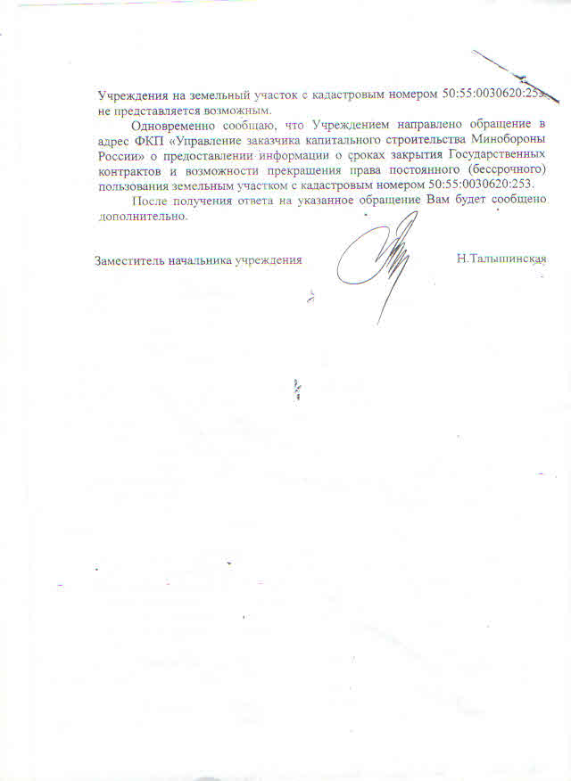 № 1919 о прекращении права постоянного (бессрочного) пользования земельным участком. Однако, ФКП «Управление заказчика капитального строительства Минобороны России» письмом от 11.07.2017 № ФКП/14,16582 проинформировало, что на сегодняшний день в рамках контракта от 2009 г. № 220609/1 (далее – Контракт) якобы не закончены работы по благоустройству и озеленению территории, строительству дорог, тротуаров и малых форм, по прокладке наружных сетей освещения микрорайона и передача земли осуществлена быть не может.