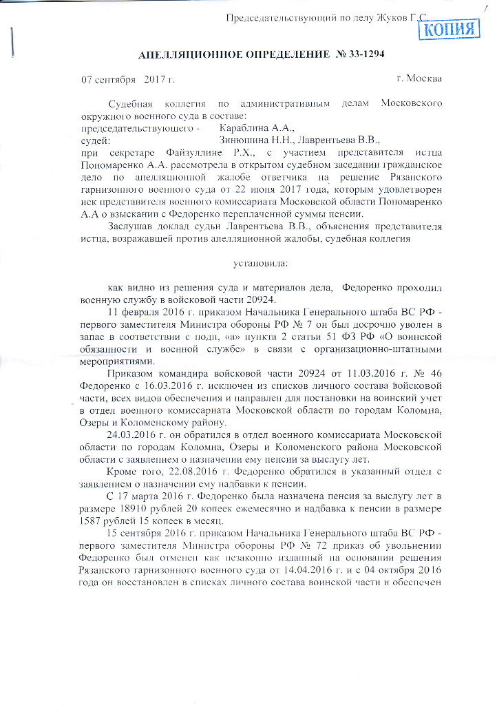 - На апелляционное определение МОВС от 07 сентября 2017 года.