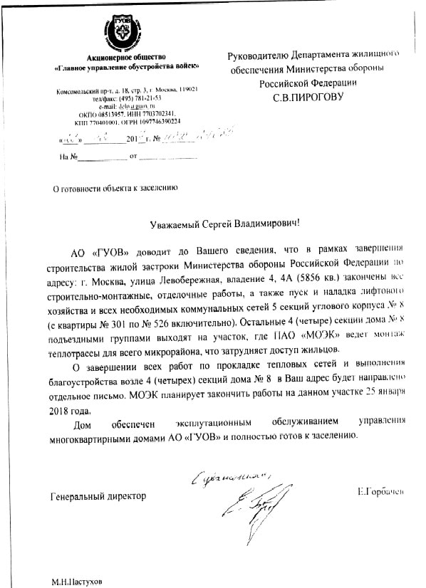 Департаментом жилищного обеспечения Министерства обороны Российской Федерации на основании сведений, представленных акционерным обществом "Главное управление обустройства войск" (далее - АО "ГУОВ"), о принятии в эксплуатацию жилого дома (письмо от 18 июля 2017 г.) и завершении регистрационных мероприятий по жилым помещениям (письмо от 5 декабря 2017 г.) с 19 декабря 2017 г. организовано заселение жилого дома по адресу: г. Москва, ул. Левобережная, д. 4, корп. 9.