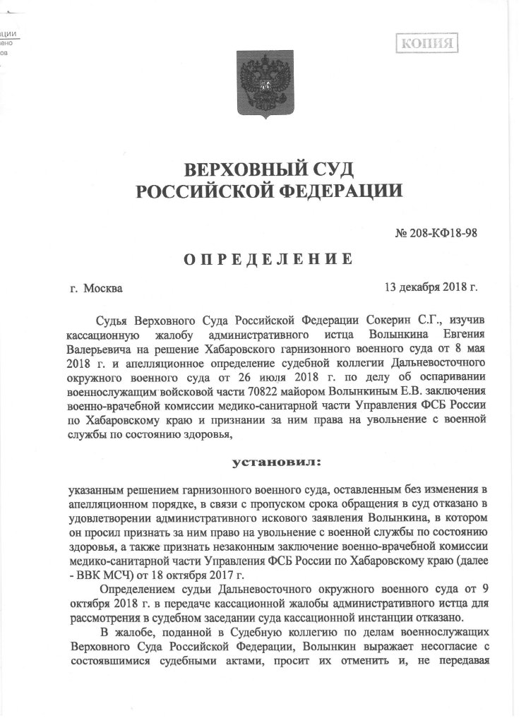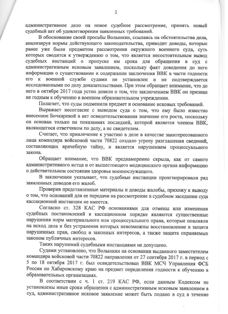 Определением судьи Приволжского окружного военного суда от 9 октября 2017 г. в передаче кассационной жалобы начальника Краснодарского высшего военного авиационного училища для рассмотрения в судебном заседании суда кассационной инстанции отказано.