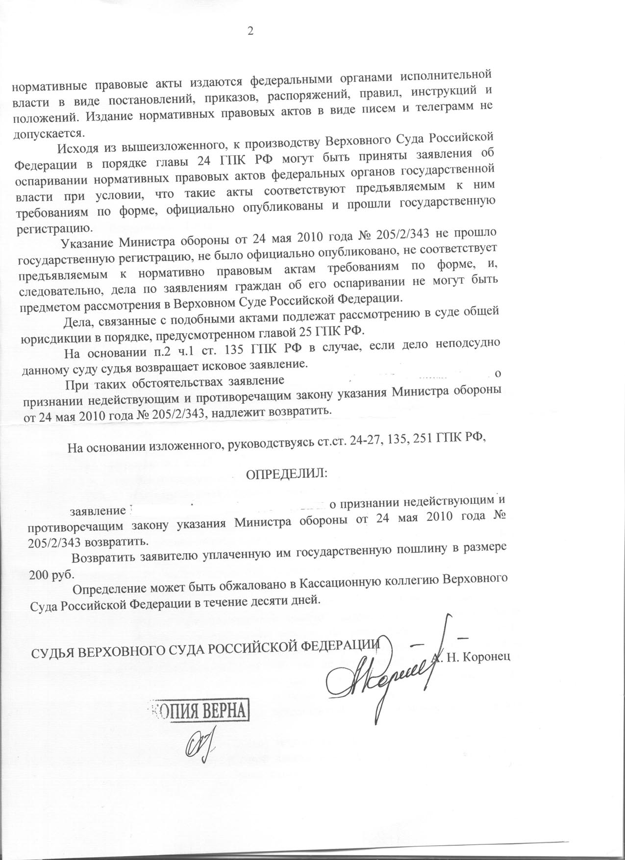 выкладываю сканименно это и было в определении Коронца))) Буду писать ЧЖ в Касс коллегию ВС РФ, почему это акт имеющий все признаки НПА ВС рассматривать по 24 главе ГПК не хочет, и не моя вина, что в МО применяют НПА не прошедшие регистрацию и не опубликованные...