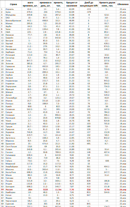 Так почему же в Москве или Питере прививают "всех желающих", но при этом общие цифры довольно низкие по сравнению с Европой, где "всем желающим" привиться не дают? В Италии, например, только-только закончили прививать тех, кто старше восьмидесяти лет, сейчас прививают семидесятилетних, а до этого занимались медиками и учителями. До более молодых и до представителей других профессий очередь дойдет ещё относительно не скоро. При этом к 18 апреля первую дозу препарата получили 10.7 миллионов человек (18% населения), а вторую дозу, то есть полностью вакцинировались - 4.5 миллионов человек, или 7,5% населения страны.