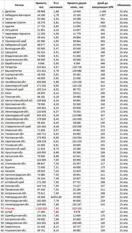 Мы уже точно знаем, что в России так называемый "оперативный штаб" с первого дня пандемии занижал в своей статистике как число заболевших, так и число скончавшихся. Это доказано как дотошными журналистами, так и другими официальными ведомствами. Но вряд ли там и число привившихся занизили. Скорей наоборот должно быть. Ведь "Спутник" выведен на передний край пропаганды (чуть ли не наравне с "Великой Победой" и "Гагариным"), тут не может быть отставания, только свершения, только успехи. А как можно говорить об успехе, если за почти полгода вакцинации первым компонентом "Спутника" привиты 10 048 048 человек (6.87% населения) и 6 154 807