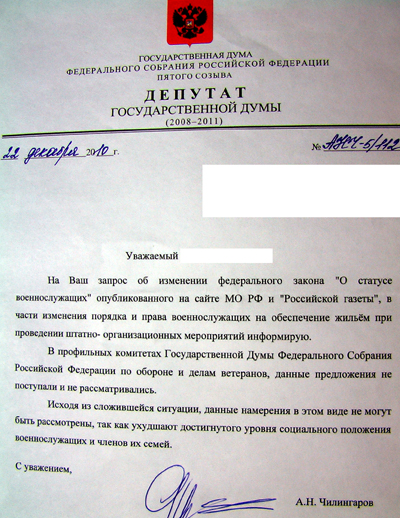 "Немного не в тему, но обнадёживает. Вернувшись сегодня со службы в почтовом ящике нашёл реальный ответ на своё (одно из многочисленных) обращений к государственным "мужам" и народным избранникам по поводу внесения изменений в закон "О статусе..." (по 23 ст.) Ответ реальный, который я держу в руках. До этого держал отписку от Верховного, перенаправившего обращение в МО, а из МО в ДЖО.... Остальные ответы на мыло кидали.