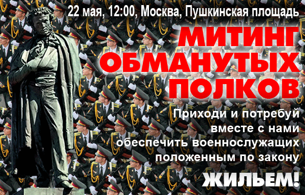 В Москве митинг будет проходить 22 мая 2011г. в воскресенье в 12:00 на Пушкинской площади (ст.м. Пушкинская) у памятника Великому поэту. Если никто в Питере не организовывает похожее мероприятие (так как митинг Всероссийский), то присоединяйтесь к нам! А те, кто боятся, им такой совет: или пусть наконец проснутся и осознают, что их ждёт дальше и найдут в себе мужества выйти и высказать по поводу этого бардака с жильём, всё что накопилось в душе или пусть спрячутся под кровать или шкаф и сидят там, как пескари премудрые! Но насильно никто никого никуда не тянет. Каждый сам должен определить, где его место: На общем построении обманутых полков или в кустах.Всем привет! Когда и где митинг? Ради такого дела и из Питера приеду. Может не один, хотя многие боятся.