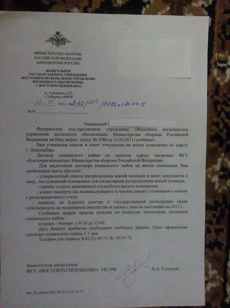 Вчера заключил ДСН на квартиру по адресу В. Клыкова 17Б он же 46. Необходимые документы: весь пакет документов по 80 приказу (я их собирал по 80), новые справки с ФРС по Приморскому краю, ксерокопии паспортов всех членов семьи и обязательный штамп в паспортах о снятии с регистрационного учета по месту проживания в служебной квартире. А также квартира должна быть сдана- подтверждением синяя справка с Шкотовской КЭЧ о сдаче жилья и листы убытия на всех членов семьи. Договора заключают по адресу г. Хабаровск ул. Ханкайская 27 кабинет № 306 (Зинаида Прокофьевна) тел: 8 (4212) 39-52-51 и телефон начальника 8(4212) 39-75-51 он же факс который стоит на автомате на приём, и в рабочее время на него не дозвонишься, но после 18.00 его переключают и начальник работает после 18.00.(Григорьева Татьяна Николаевна). Сегодня буду звонить в КЭЧ Курска. Всем желаю удачи.