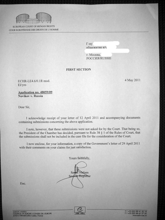 #668Жалоба №5734\08. 4мая отправили из Страсбурга ответы России. И для вас тоже есть ответ, хотя здесь уже собраны дела не на 60 чел. как изначально было, а только 27. Все написано на анг. языке.
