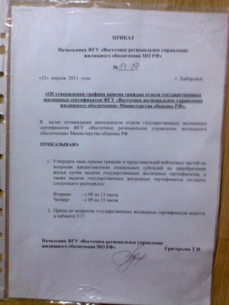 Восточное РУЖО (ул.Ханкайская,27) находится примерно в 1,5 км от ж/д вокзала. Прибыл в Хабаровск в понедельник утром. Добрался спокойно минут за 20 до РУЖО пешком без проблем. (автобуса №1 пока шел, так и не увидел). Думаю пешком получается добраться быстрей, срезая углы через дворы. Пришел к зданию около 8 часов утра. Народу около здания не было. Был только один человек для подписания ДСН. К 9 ? 9:30 утра подтянулись работники РУЖО. РУЖО находится на третьем этаже. Заходите в здание, в фойе поворачиваете по коридору на лево и поднимаетесь на 3-ий этаж. Упираетесь сразу в каб. 318 (приемная+руководитель РУЖО). В этом кабинете принимают и регистрируют документы для проверки. В кабинете находятся два работника (правый стол – сидит мужчина [он и регистрировал комплекты документов, которые я привез на 6 человек], левый стол – сидит женщина-блондинка (лет 45) видимо это и была Иванова Екатерина Дмитриевна (?), которая в начале вышла из кабинета в коридор и забрала у всех документы кто привез на проверку или дополнения к основному пакету). Через некоторое время пригласила меня зайти в кабинет. К комплектам документов на 6 человек я из части взял сопроводок (2 экз.) которые были заверены входящим. Больше никакие печати не ставят! К документам (на каждого в/сл) были и копии описи, которые были в комплектах документов. На просьбу заверить копии описей получил ответ, что отдельно регистрировать на каждого не будут т.к. они уже все доки зарегистрировали на сопроводке. Если хотите, - сами напишите № входящего из сопроводка на всех копиях описей. На повторную просьбу зарегистрировать отдельно копии описей прочувствовал некоторое раздражение у работников. Пришлось смириться с тем, что заверили только сопроводок. Комплект документов они полистно не проверяют согласно описи. Я так понял, их задача заключается только в принятии доков и их регистрации. А что вы там вложили проверят в другом кабинете. Со следующей недели у них в кабинете появится третий человек по приемке доков. Кабинет руководителя РУЖО (Григорьевой Татьяны Николаевны) находится внутри приемной с лева. Женщина лет 45-50.