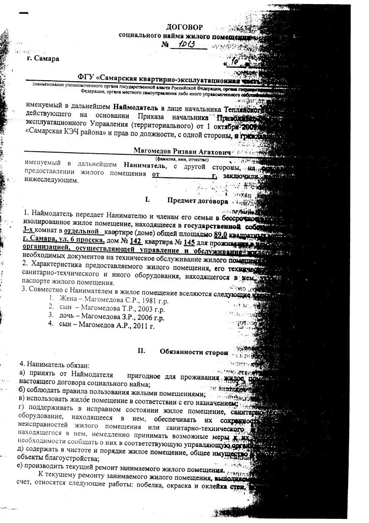 Договор № 1013 от 10 марта 2010 года заключен между майором медицинской службы МАГОМЕДОВЫМ Ризваном Агаховичем (16/11/1977 г.р., г. Тольятти, ул. Коммунальная, 22) и начальником ФГУ «Самарская КЭЧ района» на квартиру по адресу г. Самара, ул. 6 просека, дом 142 кв. 145 от МО РФ площадью 90,17 на состав семьи из 5-х человек: на себя, жену и троих детей. На момент заключения договора социального найма на указанную квартиру определением Самарского районного суда был наложен арест. У МАГОМЕДОВА Р.А. на момент заключения договора социального найма было двое (!) детей, соответственно 18*4=72 метра. Сын, указанный в договоре социального найма (Магомедов А.Р., 2011 года рождения), никогда рожден не был.