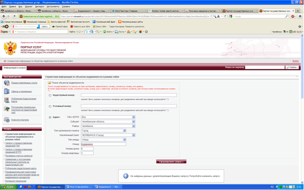 Итак, имеем: Счастливые новоселы получили ключи и справили новоселье. Далее: сформируем запрос по адресу новостройки: город Челябинск, улица Бурденюка, номер дома 6, номер квартиры 1 (или любой другой) Получаем: Не найдены данные, удовлетворяющие Вашему запросу."Военнослужащие празднуют новоселье"