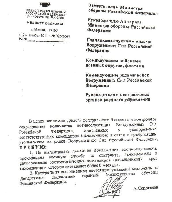 Об этом - всё на новой ветке: Указание Сердюкова - заштатникам не платить!вот это с блога Баранца В.Н. получено...Кто и как прокомментирует?