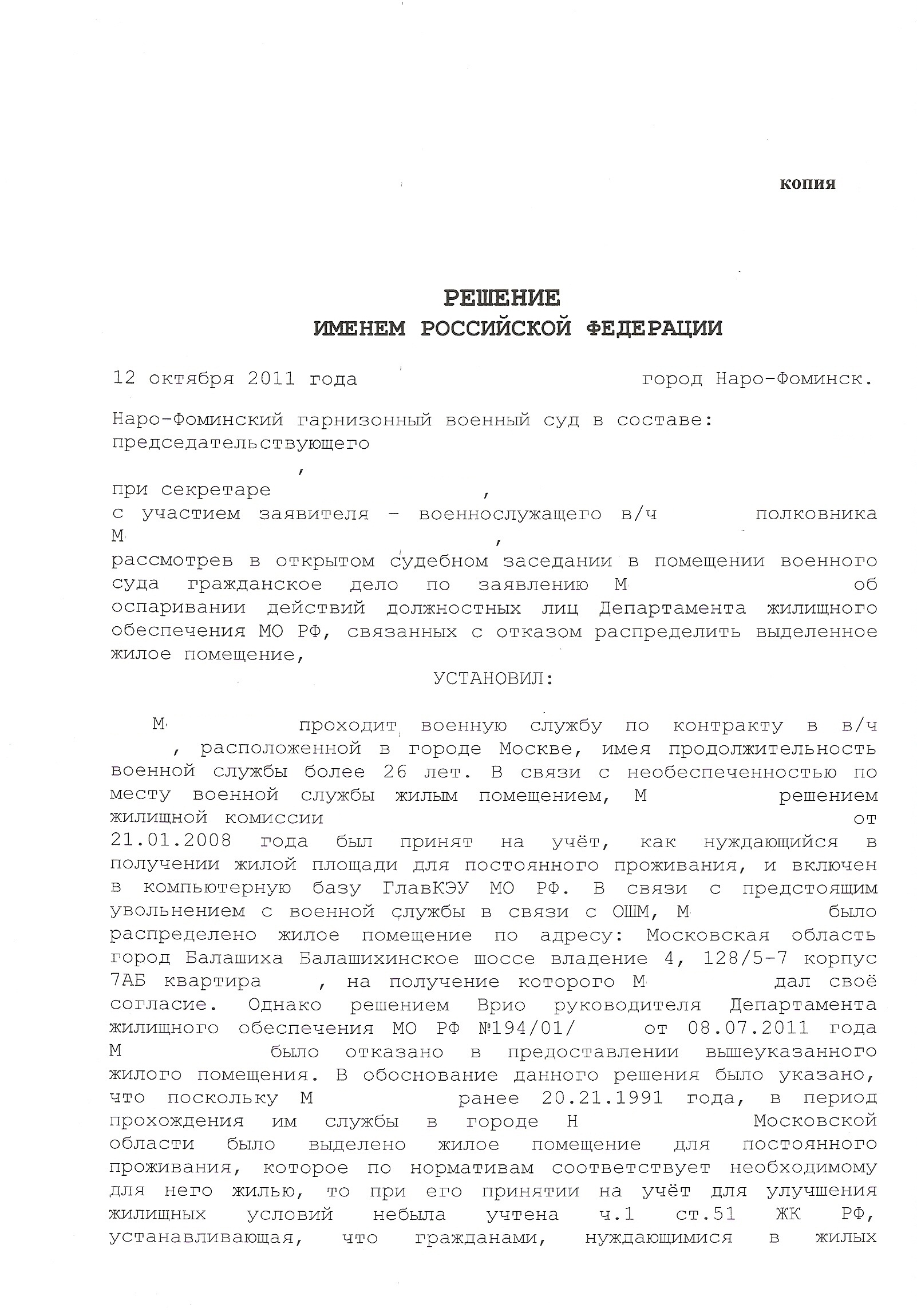 Тут выкладывал Решение ДЖО об отказе в предоставлении жилого помещения.