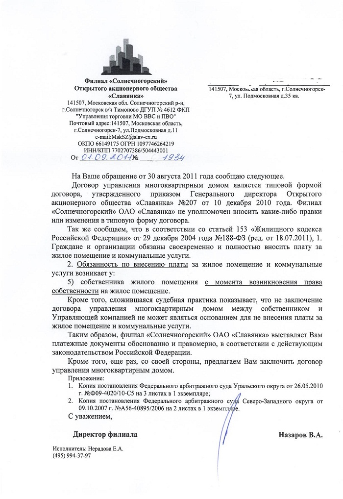 После проработки выданного мне бланка, не содержащего ни каких данных о сторонах договора, реквизитов, приложений, его цены и т.д., я направил директору филиала «Солнечногорский» ОАО «Славянка» 2 письма с просьбой оповещать меня о проведении собраний собственников жилья вх.№1978 от 30.08.2011, а так же предложение вх. №1979 от 30.08.2011г. внести некоторые изменения и исправления в проект с целью привести в соответствие с требованиями Законодательства РФ будущий Договор