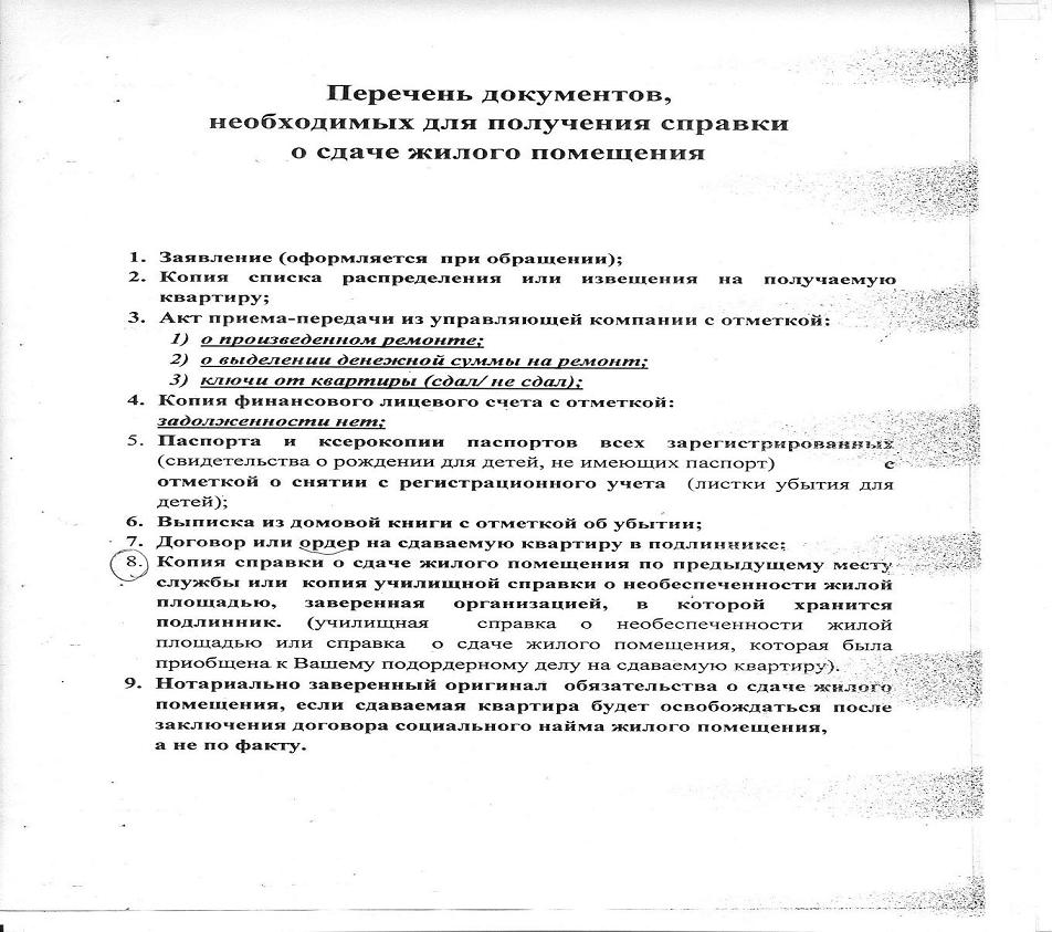 Я звонил в Кубинку, там девушка сказала что необходимо для получения справки о сдаче жилья, необходимо ряд документов... Список этих документов есть на форуме...Возник вопрос по ряду необходимых документов: