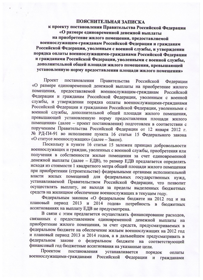 В МВД все понятно и такой расчет устроил бы многих военных, но по данному проекту компенсация почти в два раза меньше чем у МВД и не соответствует реальной стоимости квартиры. Хорошо хоть в ФЗ забили добровольность, а то точно всех бы уволили.расчет это тут http://www.rg.ru/2012/01/18/socvyplata-dok.html но не для МО, а МВД к сожалению. Там стоимость кв.м может превышать рыночную в 1,5 и более.прикладываю фин обоснование и пояснительную. Хороший проект, наверно к маю - все пенсионеры