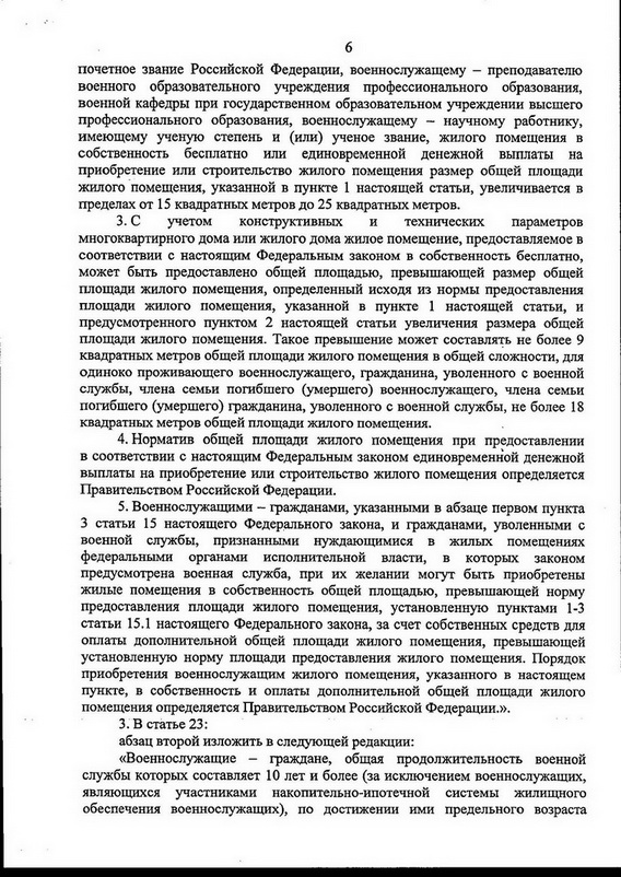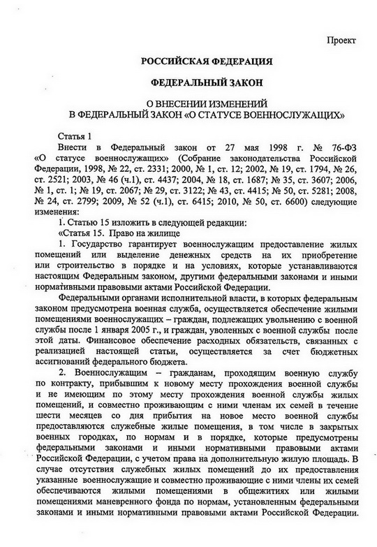 Указанная норма давно стала "бельмом на глазу" для недобросовестных высоких воинских должностных лиц. Она не дает увольнять военнослужащих, имеющих право на жилье, без этого жилья. В 2009 г. была предпринята очередная попытка исключить эту норму из Федерального закона "О статусе военнослужащих". Эта законодательная инициатива была оформлена в виде предложений Правительства Российской Федерации, которыми предлагалось обеспечивать указанную категорию военнослужащих постоянным жильем после увольнения, однако Президент Российской Федерации 17 июля 2009 г. категорически не согласился с этим, оценив это как ущемление интересов данной категории военнослужащих и членов их семей и направив Правительству Российской Федерации соответствующее поручение о внесении соответствующих предложений с учетом недопустимости снижения уровня правовой и социальной защиты увольняемых военнослужащих и членов их семей.