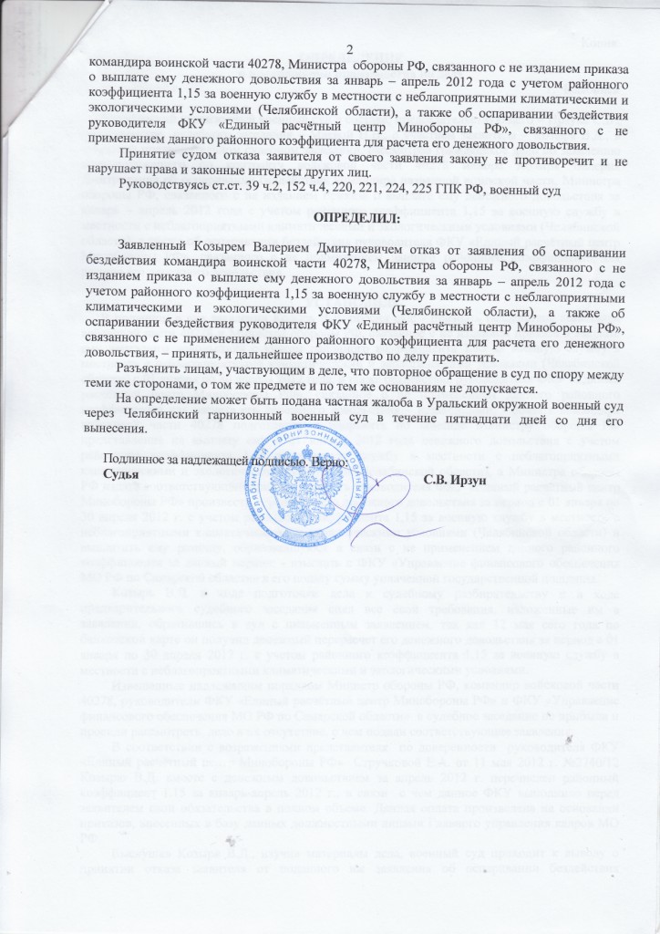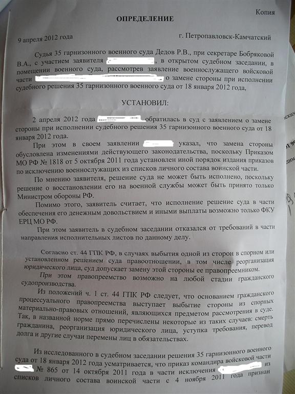 Попытался вчера заменить ответчика по вступившему в силу решения суда о восстановлении в списках части с команандира на министра и ЕРЦ. Отказ. Теперь вот