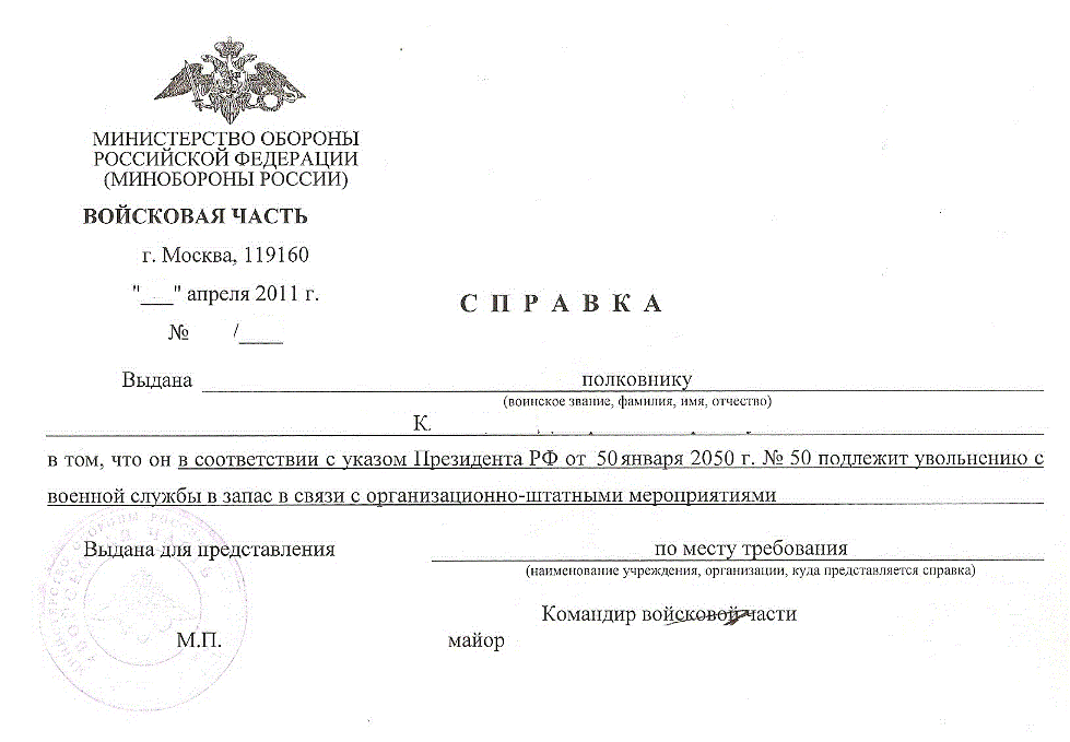 Т.о. если написать рапорт с просьбой предоставить жилье и уволить (по болезни "В", выслуга 16 лет), то справочку мне кадры при всем желании дать не смогут! И телеграмма НГШ не поможет.