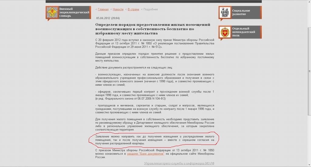 Изобрели "велосипед", а "инструкцию пользования" никак не напишут...Re: Самара - 24 апр 2012Вот за ДСН то мы и бъемсяПолучил письмо из ФГУ "Востокрегионжилье" о предоставлении жилья в собственность: доводим до вашего сведения, что приказом МО 1850 от 13.10.2011г не установлен уполномоченный орган для реализации данного приказа. На сегодняшний день ФГУ не является уполномоченным органом для исполнения требований данного приказа. Одновременно сообщаем, что отказавшиеся заключать ДСН приравниваются к военнослужащим, отказавшимся от распределенного жилья . Квартиры подлежат изъятию и возвращению в ДЖО для последующего перераспределения.