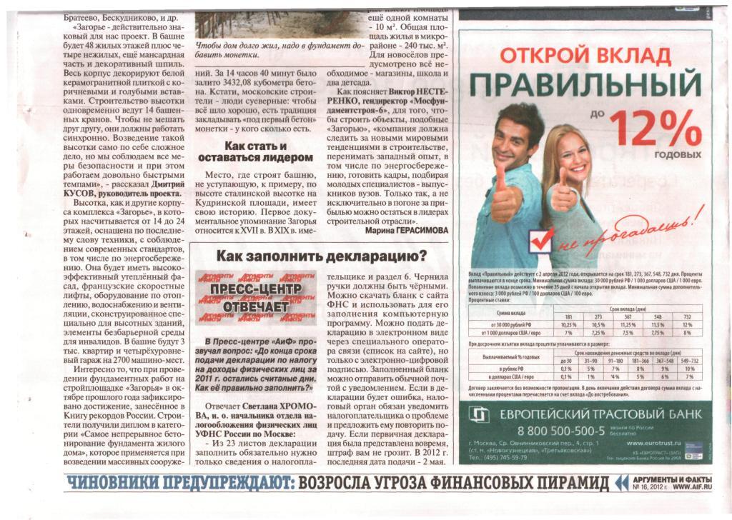 Подтверждаю - АИФ № 16 за 18-24 апреля, стр.28 - "Визитка со шпилем" в разделе "Деловая среда".