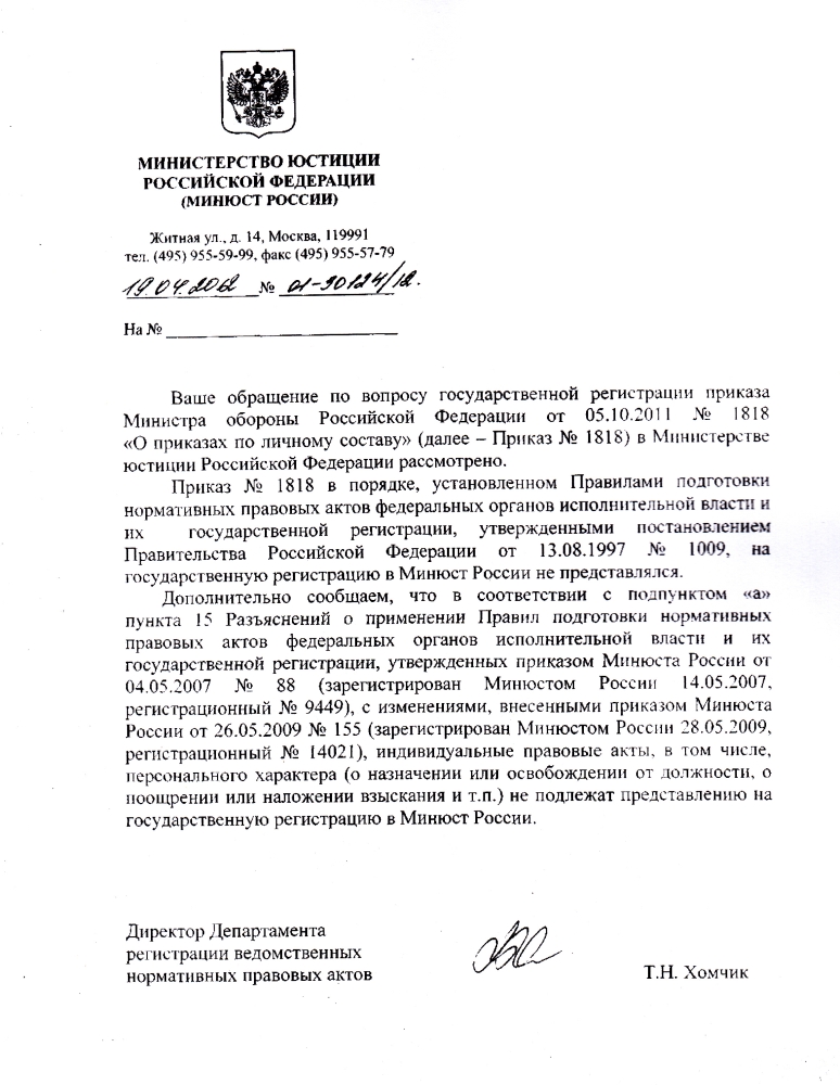 #337Приказ Мо № 1818 на регистрацию не направлялся.