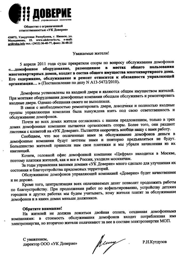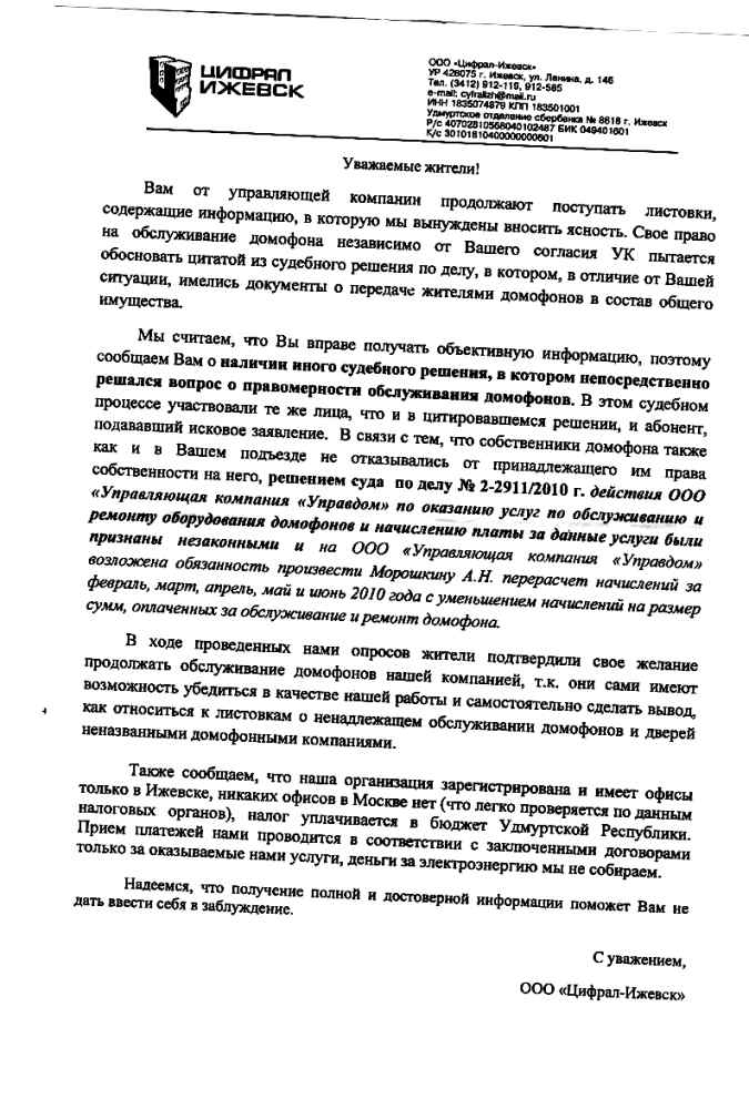 Прошу разобраться в деятельности домофонной компании по вопросу навязывания замены домофонов.
