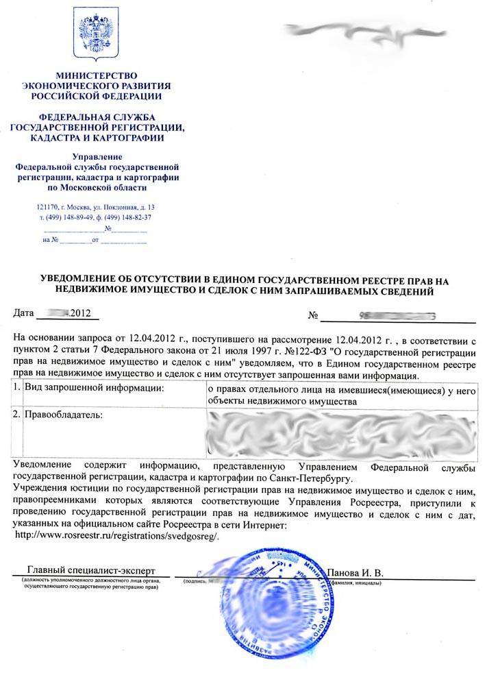 Росреестр - уведомление об отсутствии запрашиваемых сведений